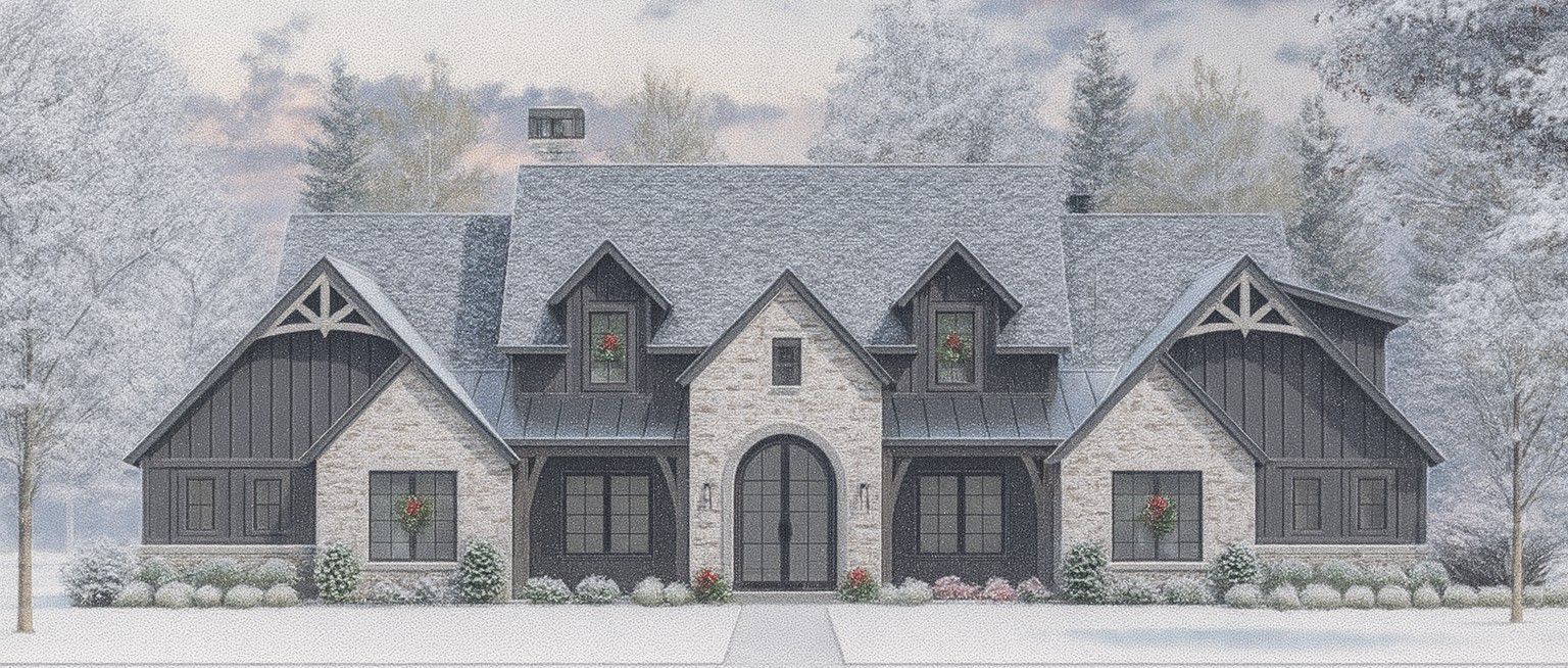 The façade blends brick, wood, and metal in a symmetrical layout — twin gables, well-balanced windows and entries, and an arched double-French-door main entrance that opens into a vaulted, beamed foyer.