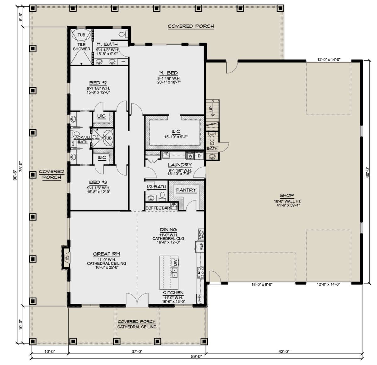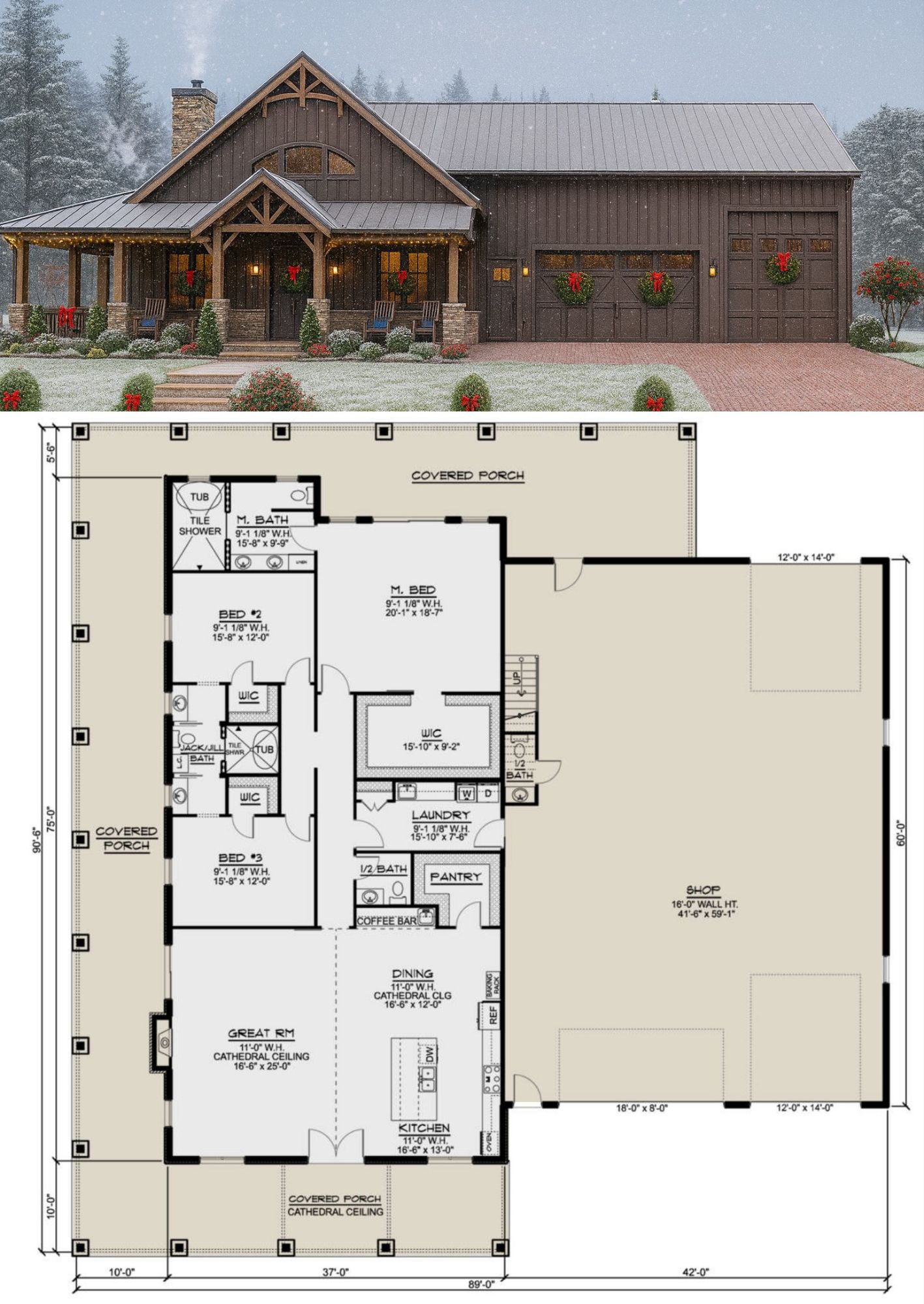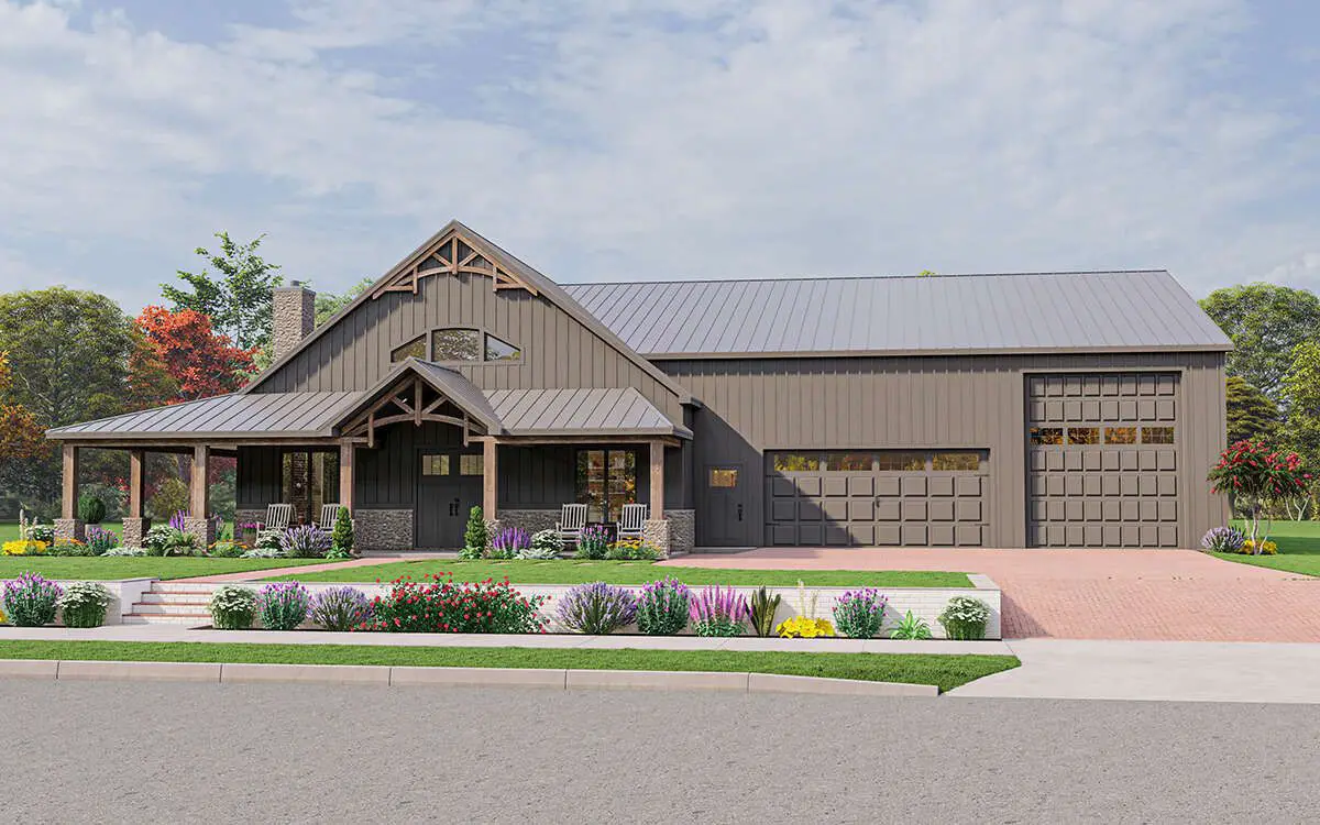 The exterior carries strong barndominium-style appeal: dual overhead gables (one closed, one open), stonework, and wood-pillar accents. The footprint extends to about **89 ft wide × 90 ft-6 in deep**, giving the house a broad, barn-like presence.
