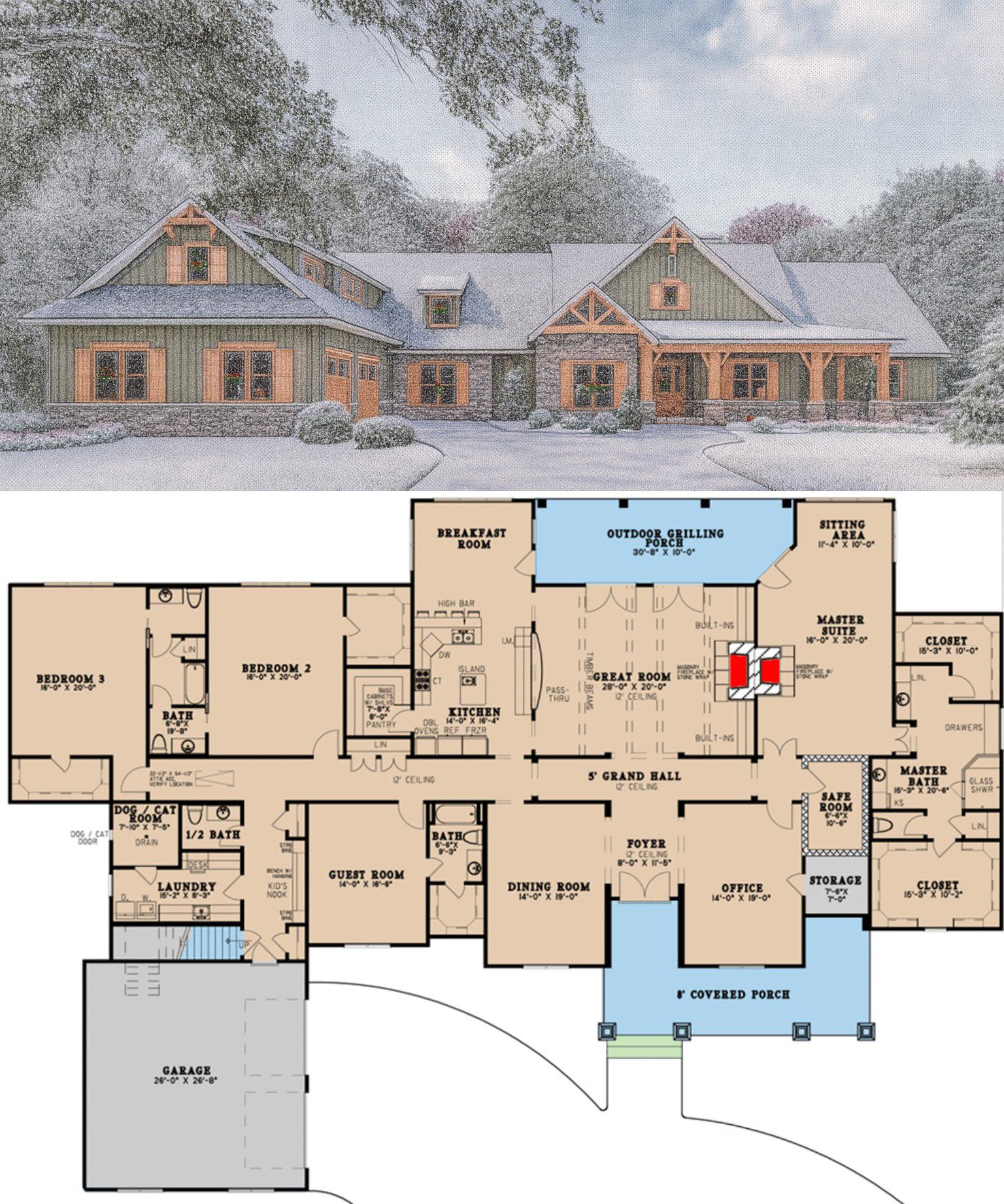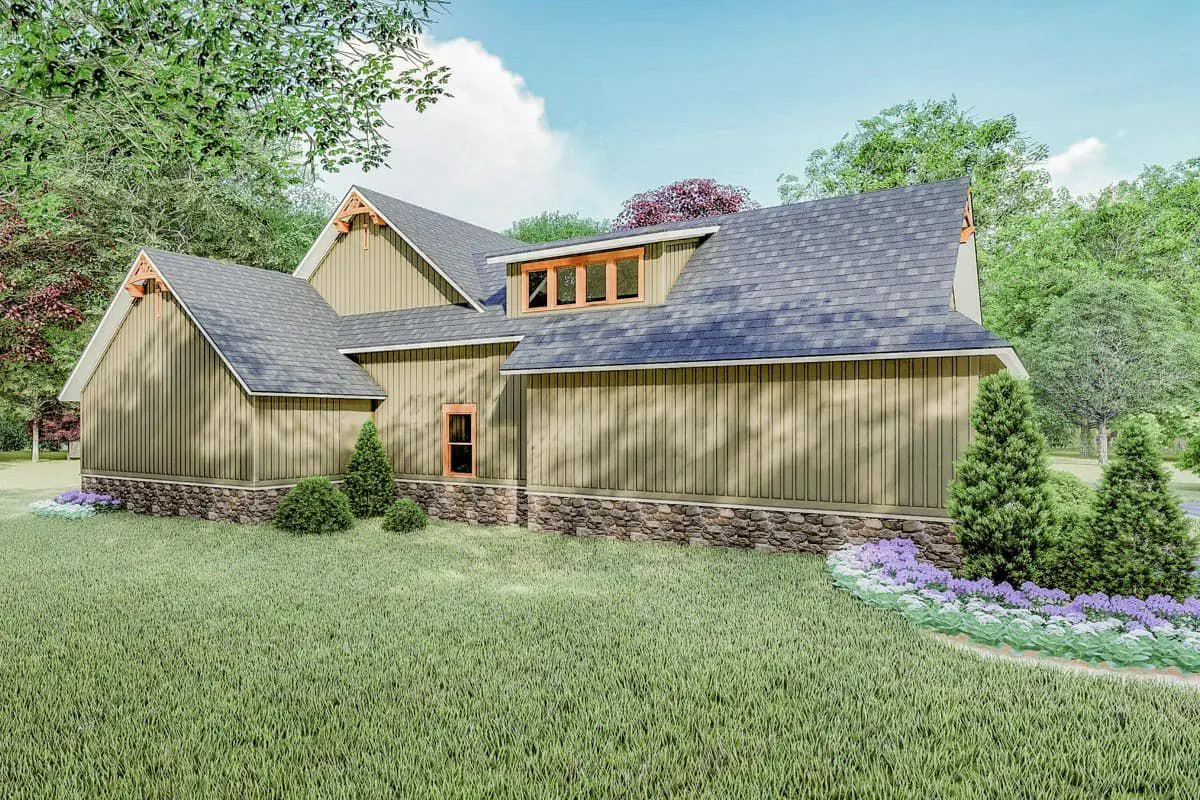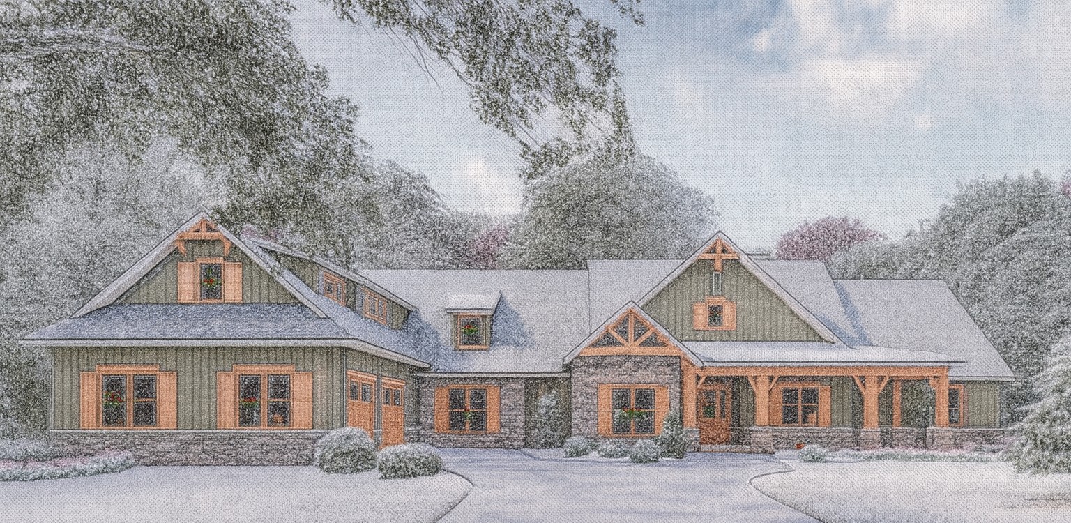 The exterior features classic Craftsman detailing — expect stone accents, tasteful massing, and a broad footprint (~ 117′-9″ wide × 81′-10″ deep) that conveys solidity and presence.