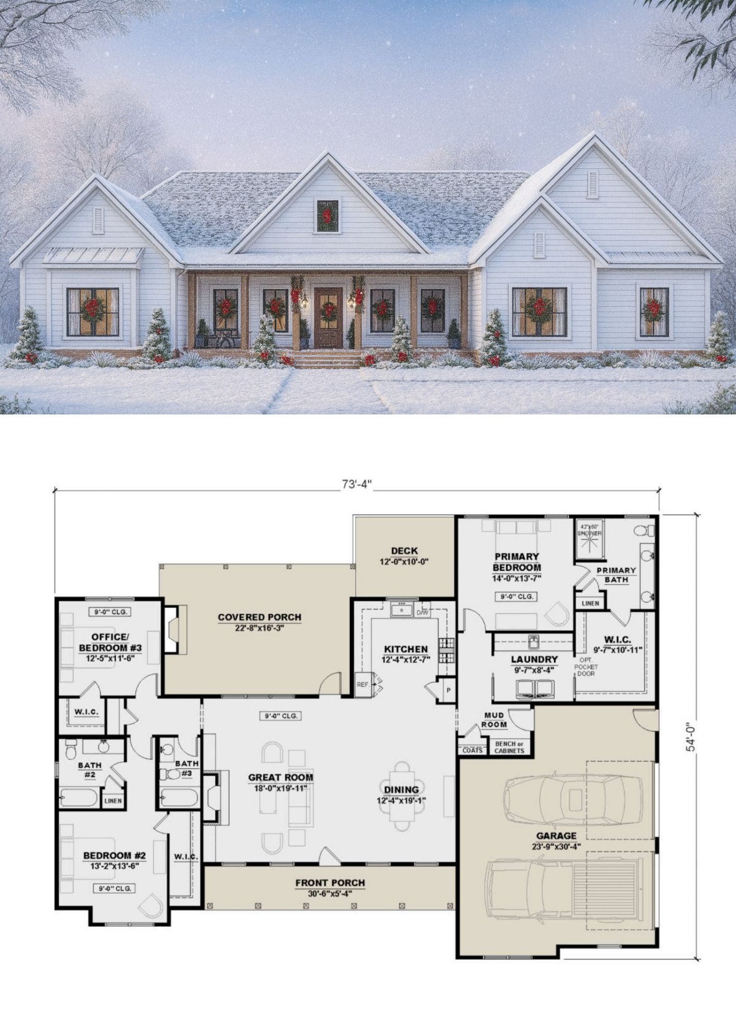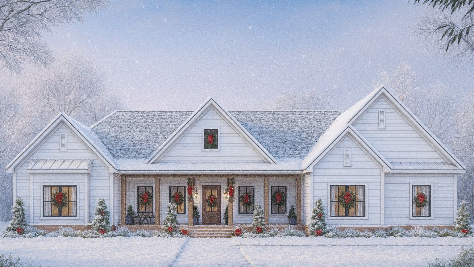 This modest-sized modern farmhouse offers about 2,060 sq ft of heated living space — a smart option for smaller families, couples, or those wanting an efficient home without excess.