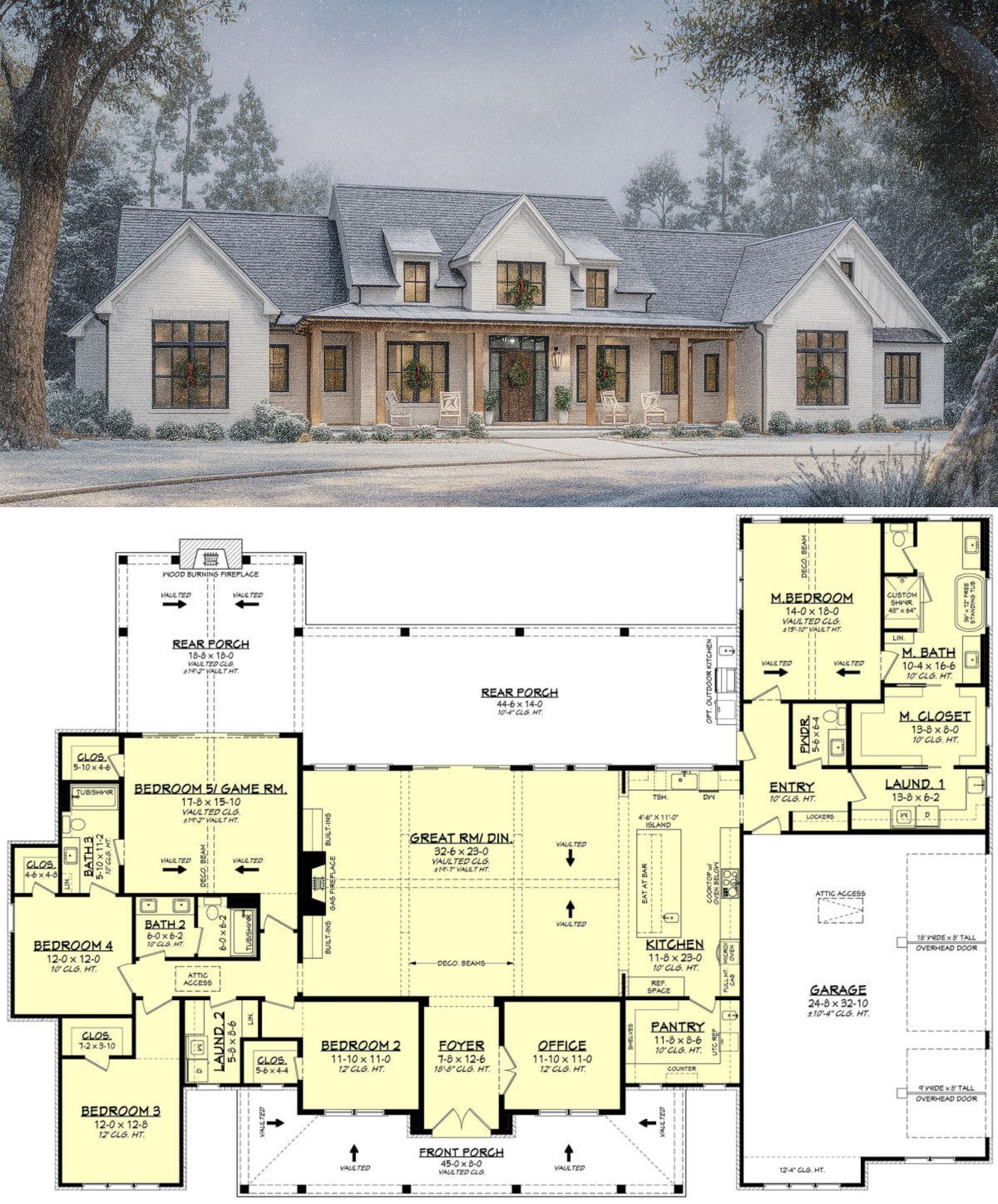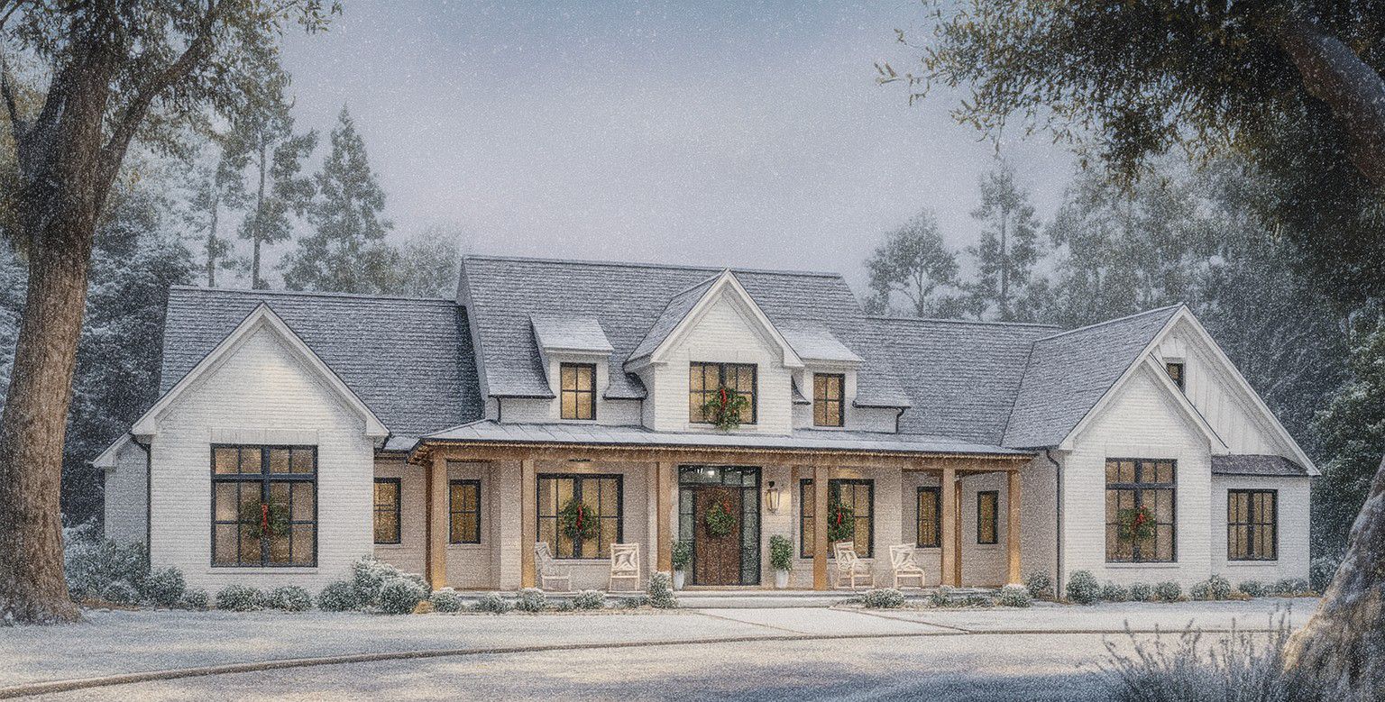 The house presents a clean and inviting farmhouse exterior: with a wide footprint and balanced proportions, it delivers a substantial presence without feeling overly massive.