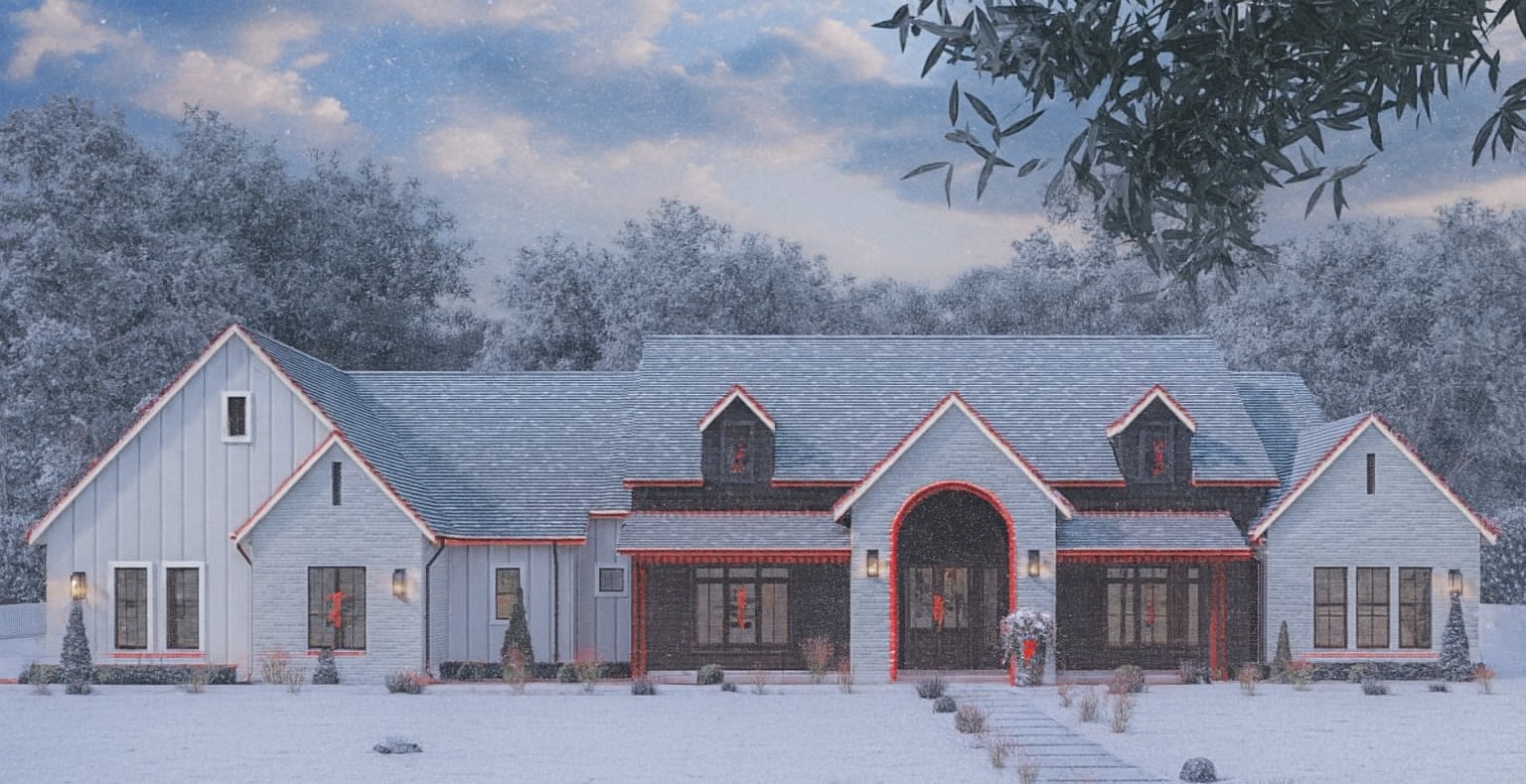 The exterior blends classic farmhouse lines with transitional and modern influences: expect a mix of board-and-batten, clapboard, and brick accents that give the home a refined yet welcoming curb appeal.