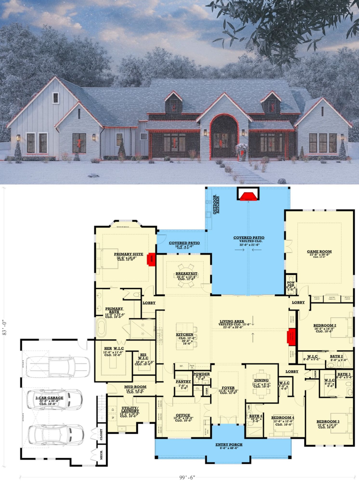 A broad front porch leads into the home and creates lovely outdoor seating space, while the side-entry 3-car garage keeps the front façade clean and balanced. The overall footprint spans roughly **99′ 6″ wide × 83′ deep**, with a modest ridge height of about **27′**, giving the house a solid, grounded presence.