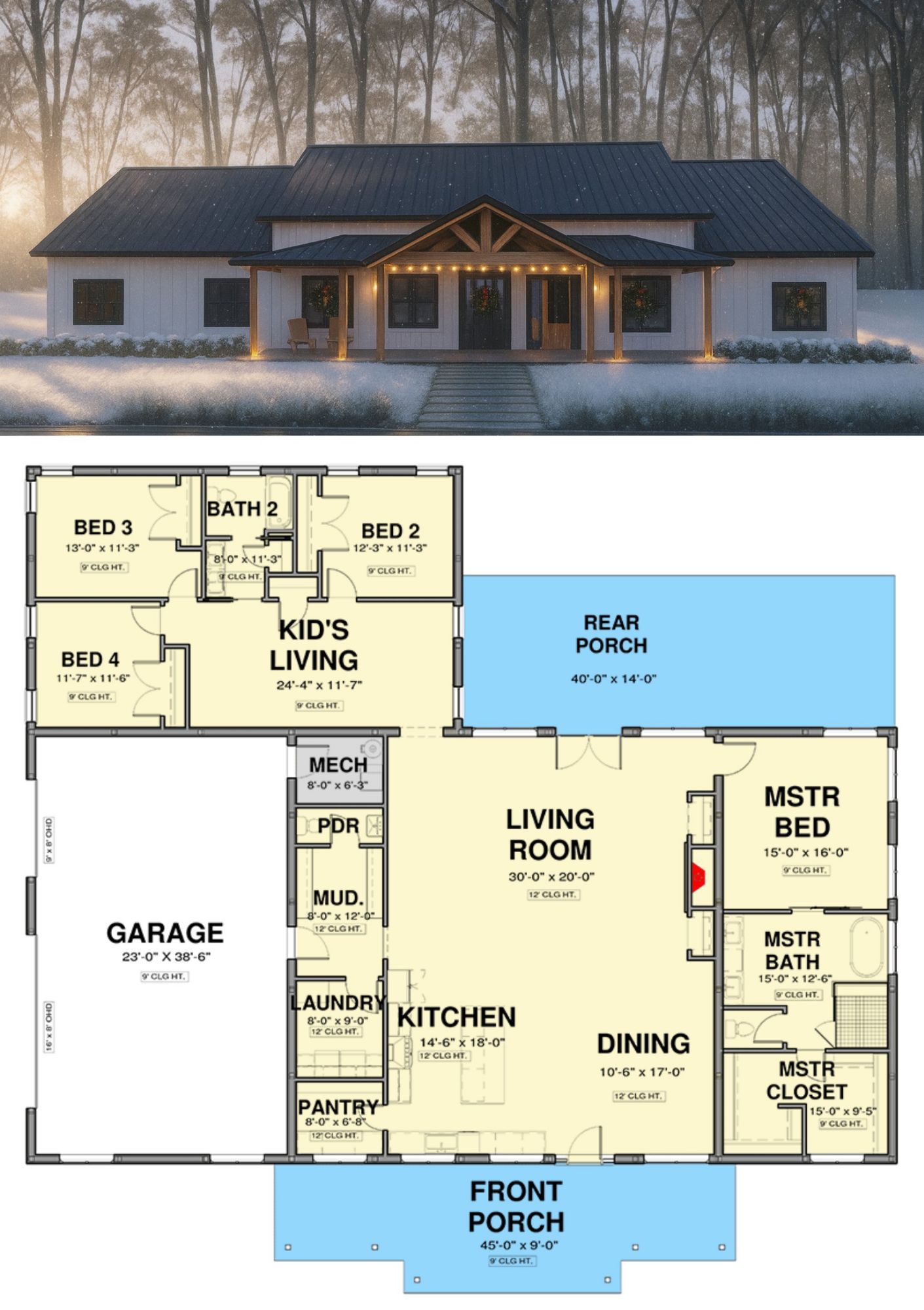From the exterior, the home presents classic modern farmhouse styling with clean lines, board-and-batten siding, and generous covered porch areas.