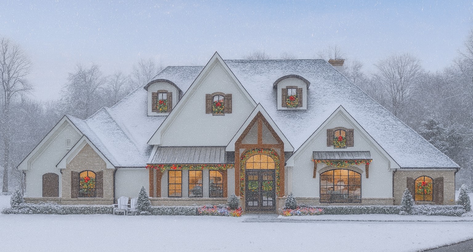 The architecture feels solid and welcoming, designed to sit naturally on larger lots or scenic properties. Covered entry areas soften the scale and provide shade, while thoughtful rooflines add visual depth without feeling busy.