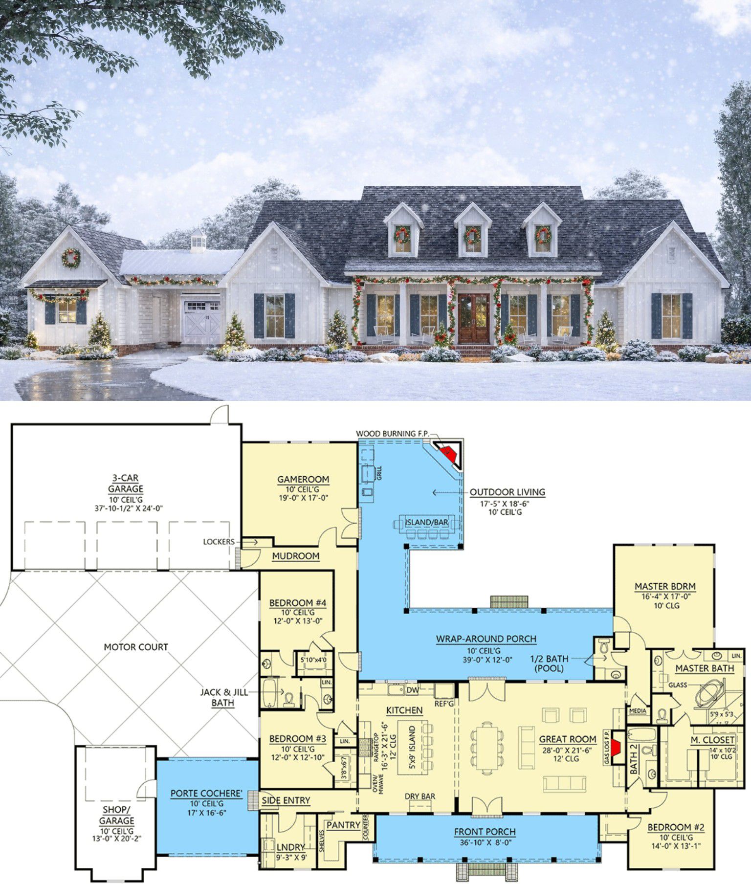 This country classic plan blends **timeless appeal, functional flow, and refined everyday spaces** to suit families, entertainers, or those seeking a harmonious balance between private retreats and social hubs. The porte cochere with motor court creates a refined arrival experience, while expansive outdoor living spaces — including fireplaces, grilling zones, and porch seating — encourage year-round enjoyment. Thoughtful separation of bedroom wings, flexible game space, and generous storage options make this design adaptable for changing needs and lifestyles.