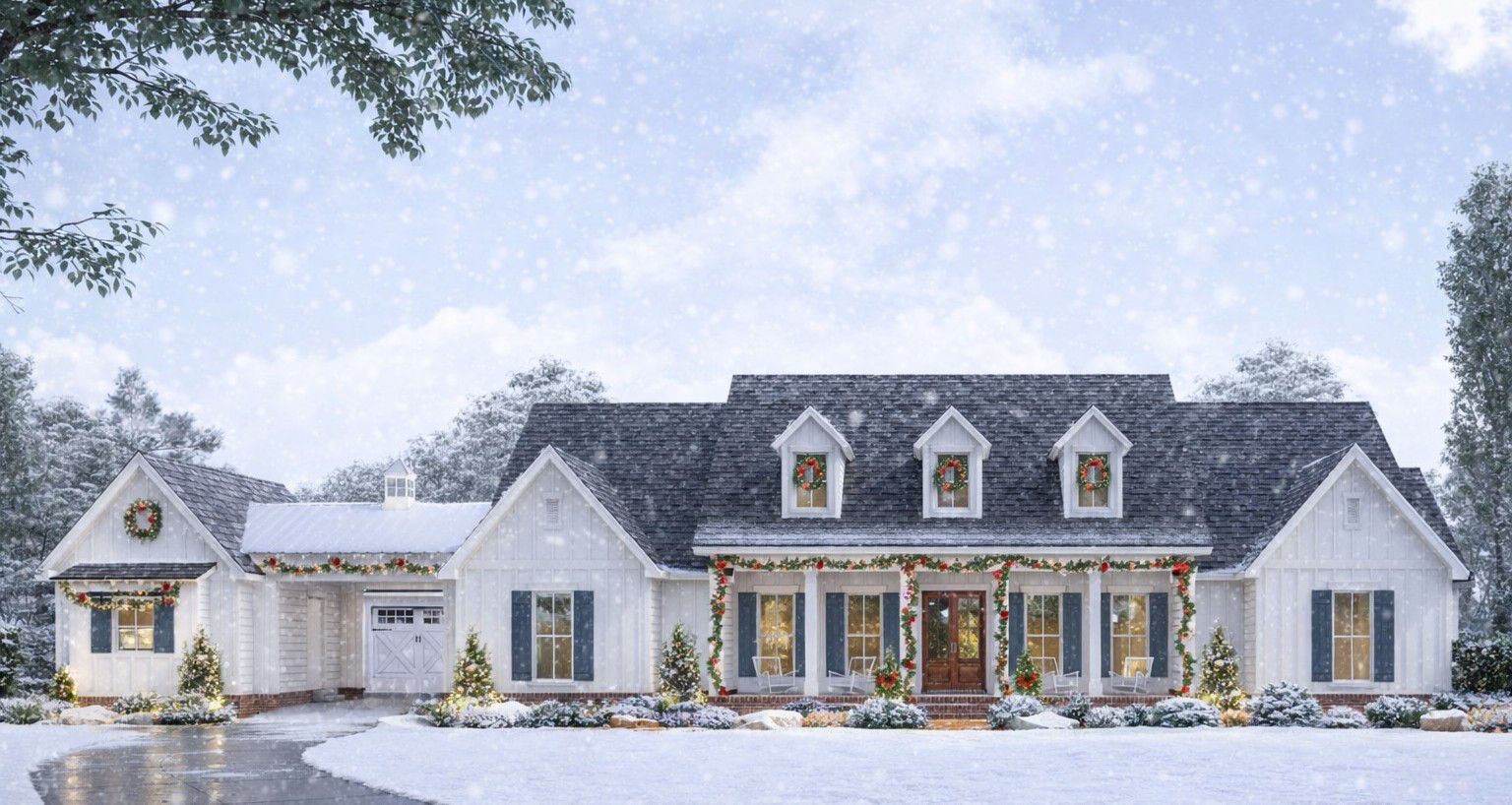 This elegant country classic home plan offers approximately 3,272 sq ft of thoughtfully organized living space in a single-story layout. The design includes 4 bedrooms, 3 full bathrooms + 1 half bath, and an attached 4-car garage area (including a versatile fourth bay for a workshop or storage).