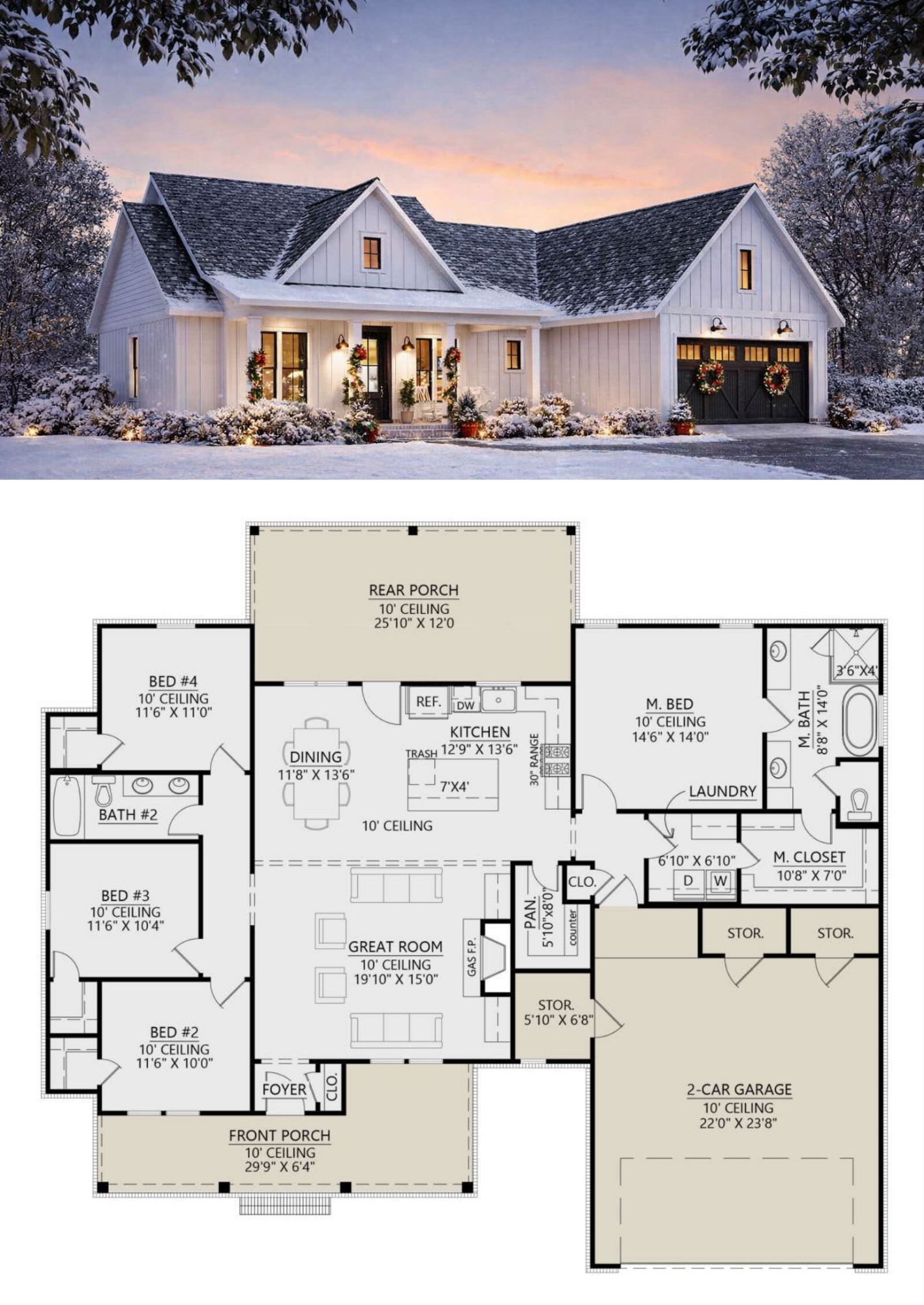 This modern farmhouse home plan offers about 1,843 sq ft of efficiently arranged living space in a single-story design with 4 bedrooms and 2 full bathrooms.