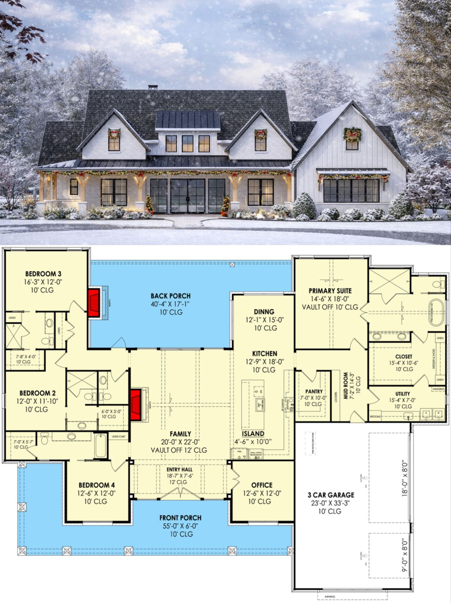 This modern farmhouse layout thoughtfully combines **open, connected living spaces** with **private bedrooms, a dedicated home office, and everyday conveniences like direct laundry access from the master suite**. The generous porch areas create seamless transitions between indoor and outdoor living, while the ample storage and functional features support busy family routines and entertaining alike. Whether you’re hosting guests or enjoying quiet family evenings, this design provides versatility, comfort, and timeless farmhouse character.