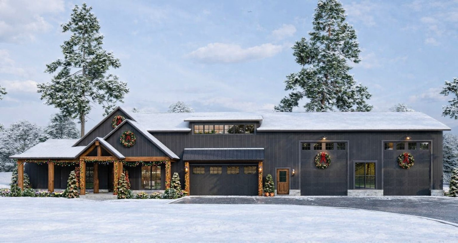 This home’s façade reflects contemporary rustic appeal with a streamlined barn-style profile, balanced vertical siding, and warm structural accents.