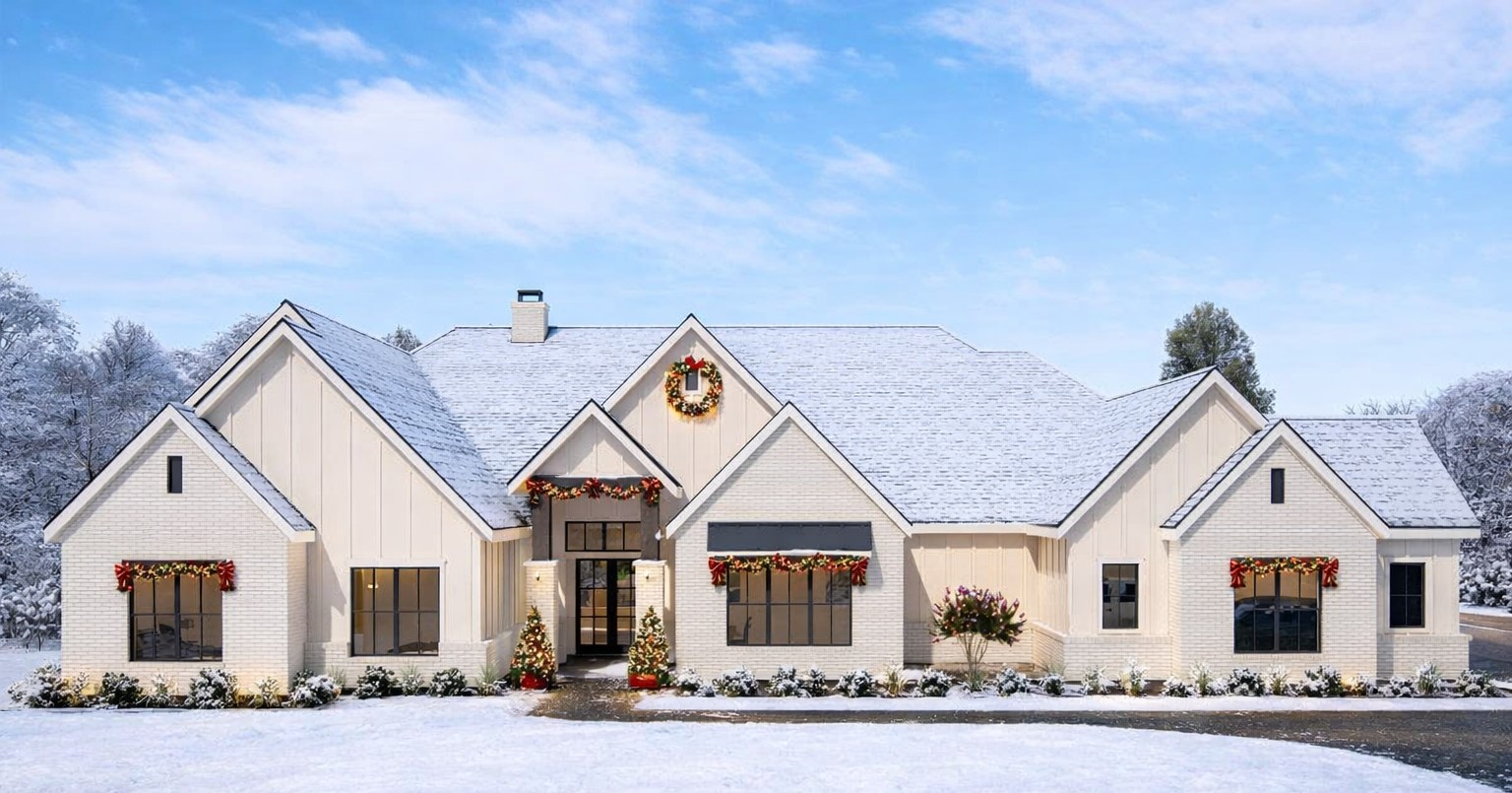This plan’s exterior pairs classic American ranch character with modern design touches. Broad gables and clean rooflines combine with mixed siding textures to give the façade both depth and presence.