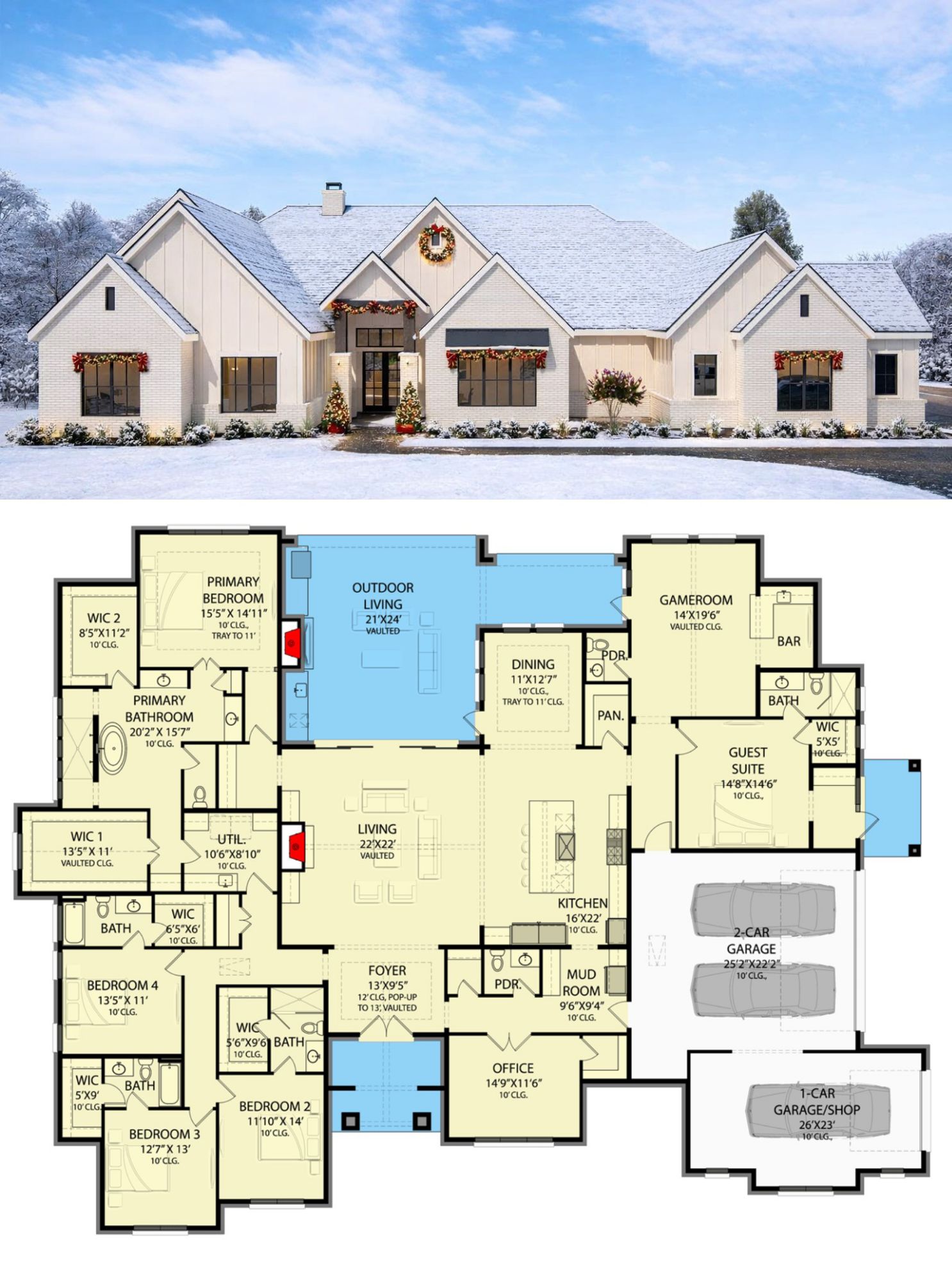This New American ranch home blends **spacious open living areas** with **private retreats, functional work and guest zones, and generous outdoor living spaces** — ideal for families, extended stays, and multi-purpose living. The inclusion of a guest suite and dedicated office enhances flexibility for modern lifestyles, while expansive shared spaces and thoughtful circulation support everyday life and entertaining alike.