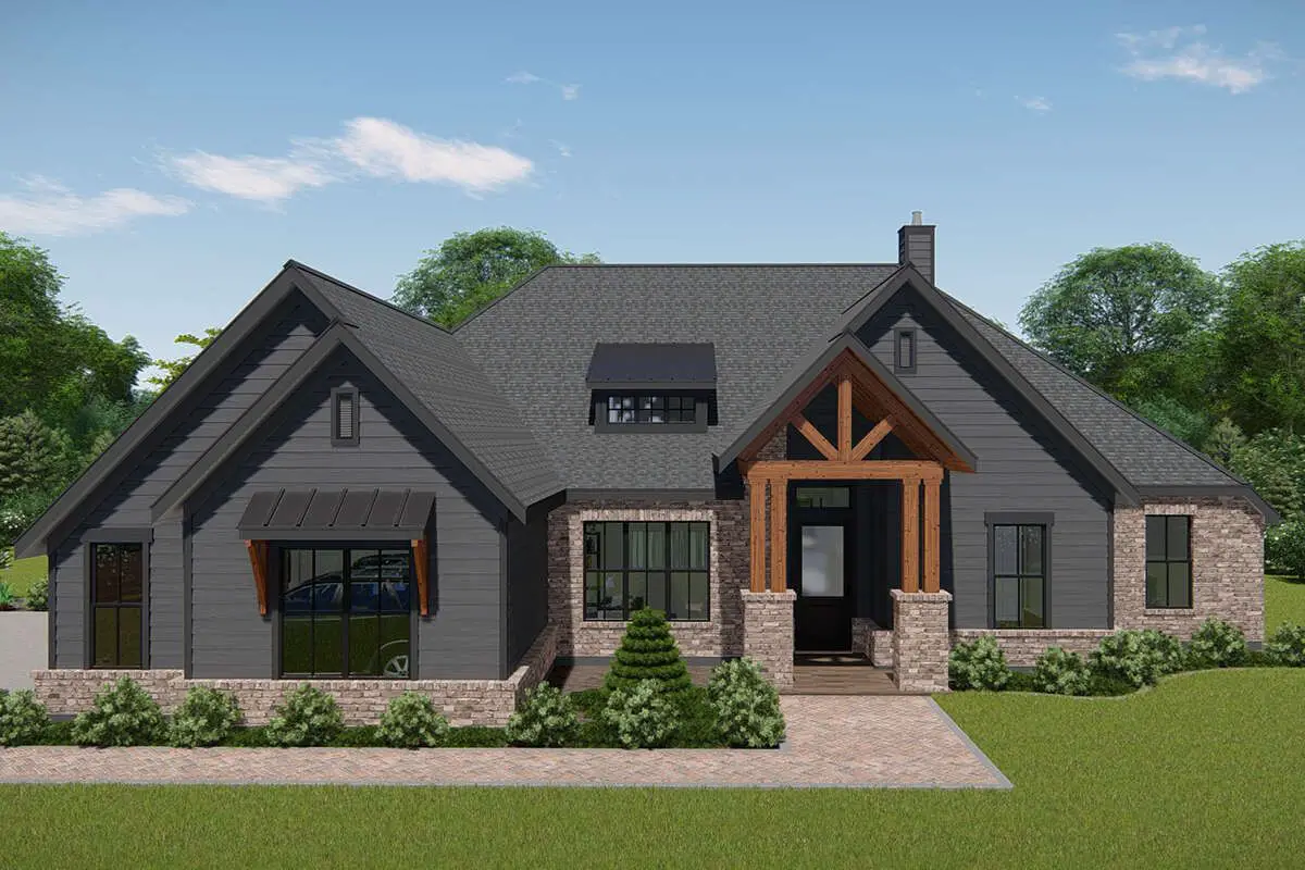 This Craftsman-style home plan offers about 2,812 sq ft of well-designed living space in a single-story layout with a flexible bedroom arrangement that supports family living, guest accommodations, and adaptable use.