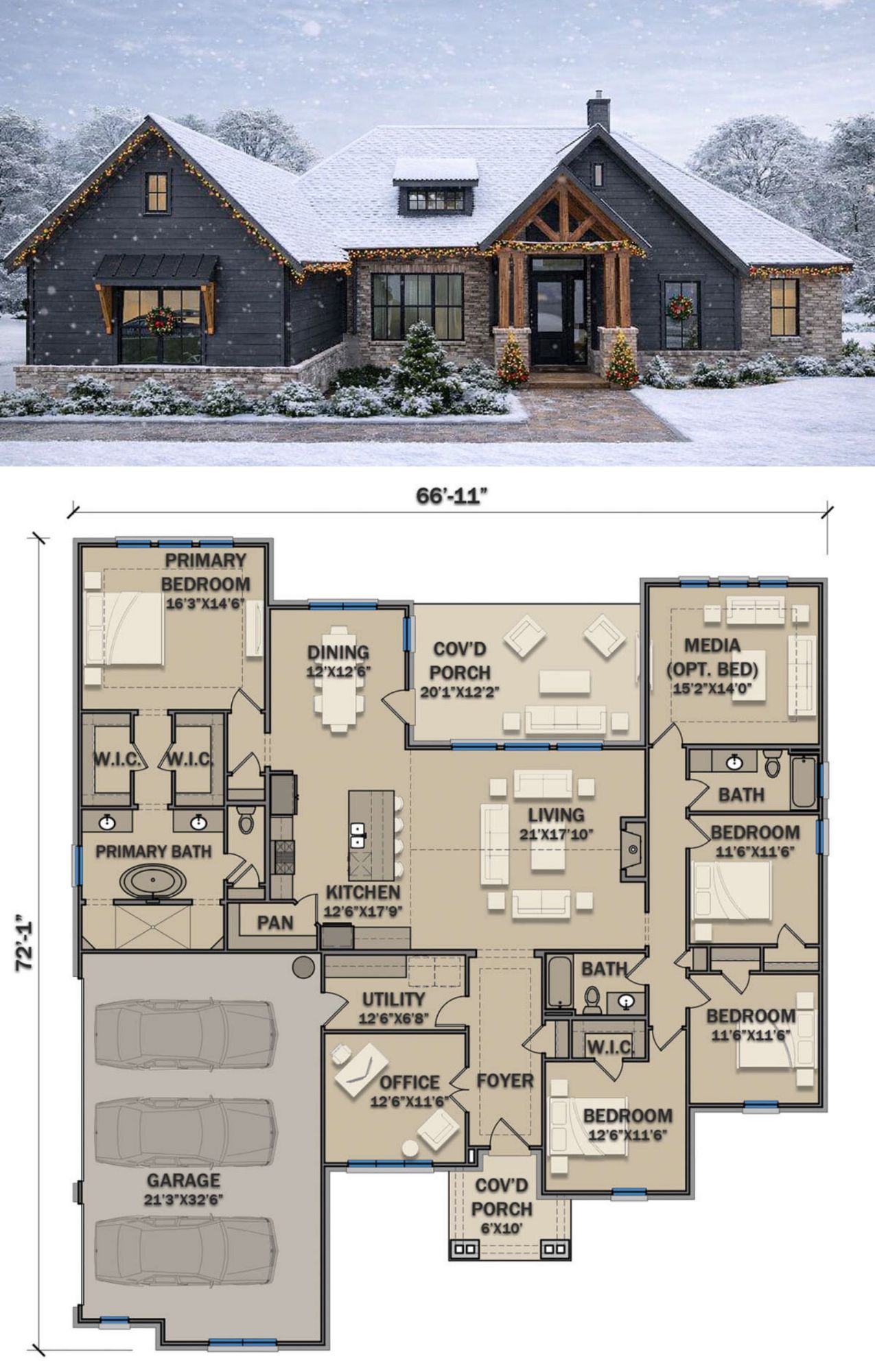 The home’s footprint, roughly 66′-11″ wide × 72′-1″ deep, makes it a strong yet comfortable presence on suburban or rural lots.