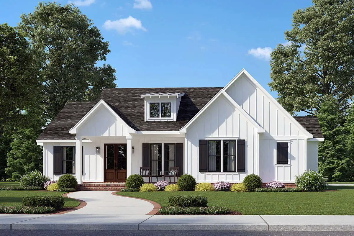 This modern farmhouse plan provides approximately 1,676 sq ft of thoughtfully arranged single-story living space with a layout that emphasizes everyday comfort, cozy shared areas, and smart bedroom placement.