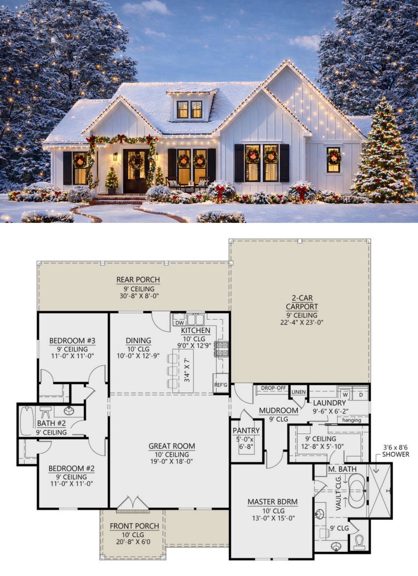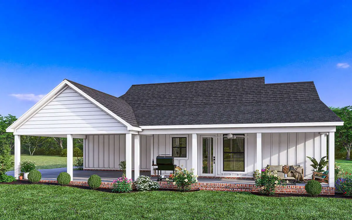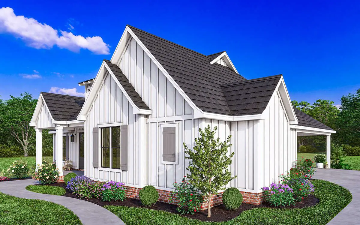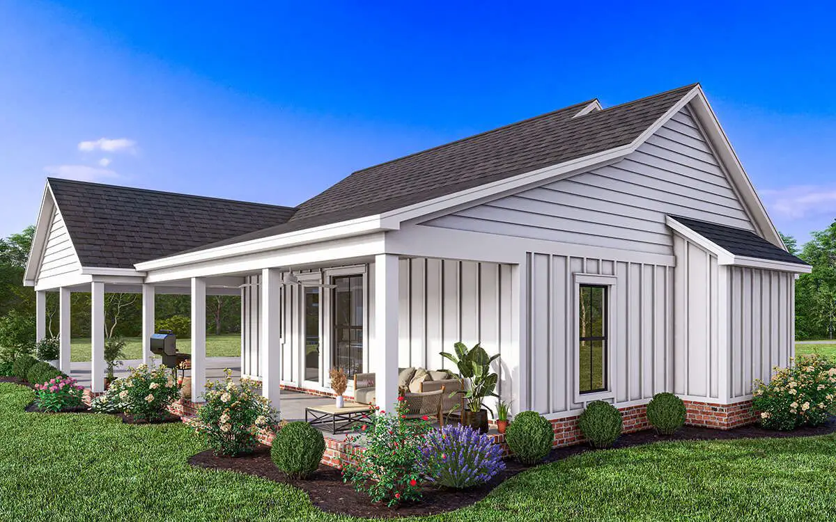 The façade’s combination of traditional farmhouse cues with modern simplicity fits well on a variety of lots, from suburban to rural settings. The overall footprint remains compact yet purposeful, maximizing efficient indoor space while preserving outdoor presence.