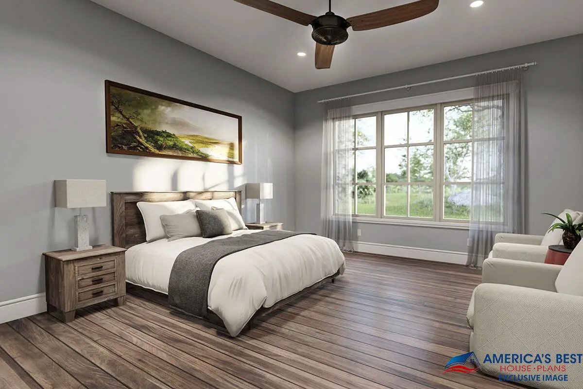 This modern farmhouse layout thoughtfully combines **open, connected living areas** with **private bedroom zones** and generous outdoor living spaces. Its balance of social and personal areas supports both everyday routines and entertaining, while covered porch zones enhance indoor-outdoor lifestyle potential. The efficient arrangement of bedrooms, functional common areas, and sizable garage make this an appealing choice for families seeking timeless farmhouse character with versatile, modern amenities.
