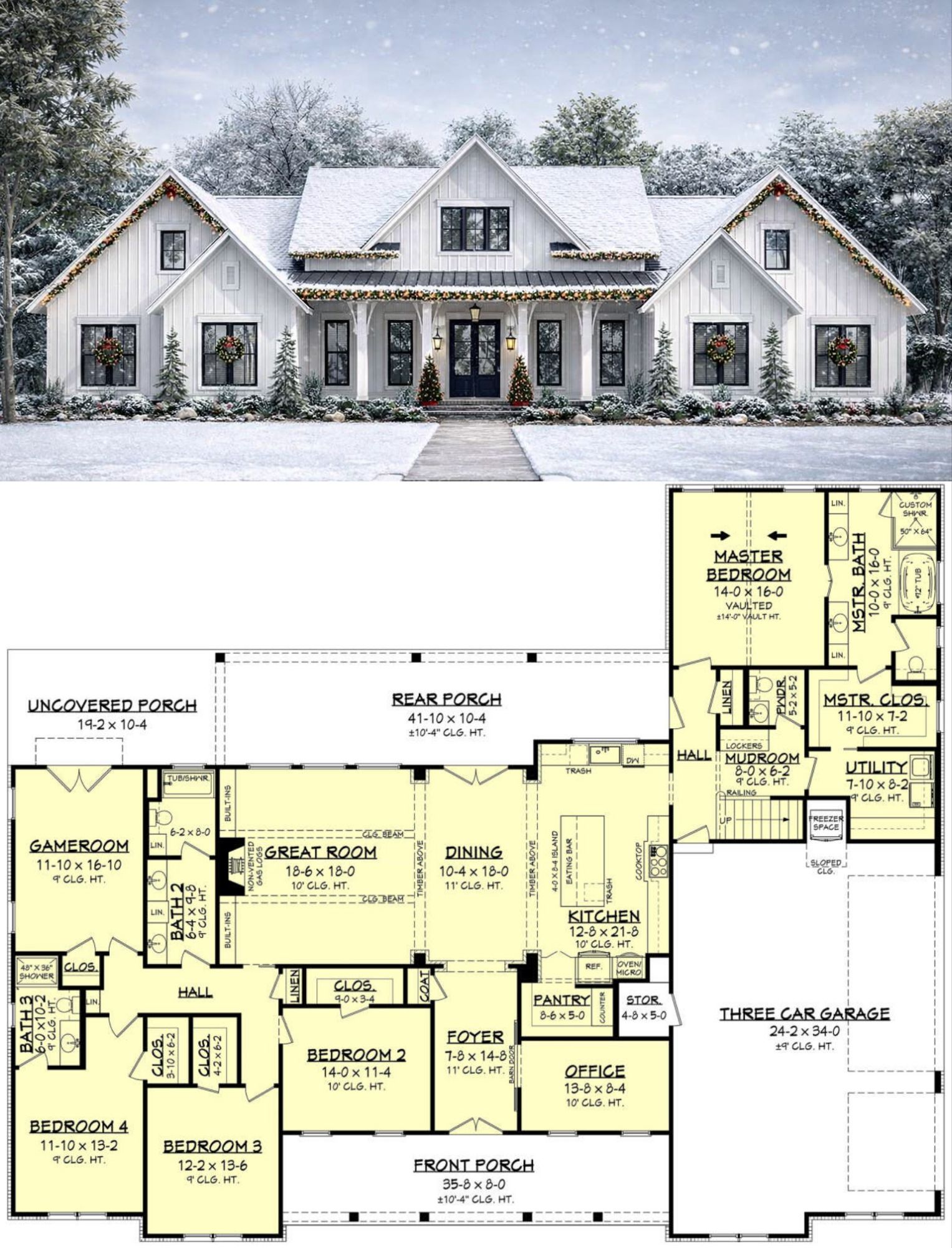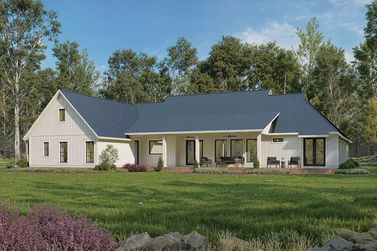 This modern farmhouse plan provides roughly 3,086 sq ft of thoughtfully designed living space in a single-story layout with a split bedroom arrangement that supports both privacy and social gatherings.