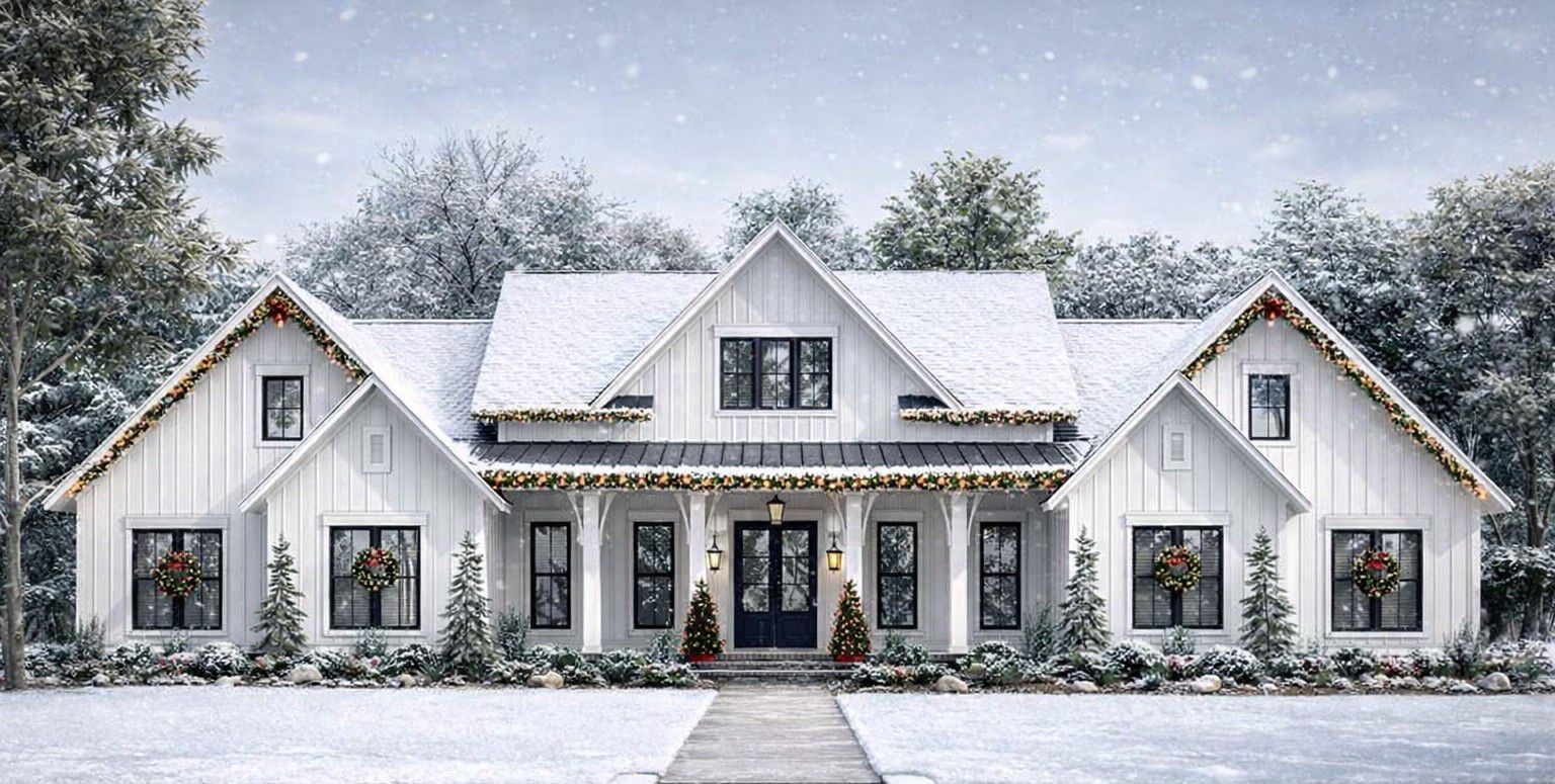 The exterior features clean modern farmhouse lines accented with balanced gables, vertical siding panels, and welcoming porch spaces that add to its timeless yet relaxed appeal.