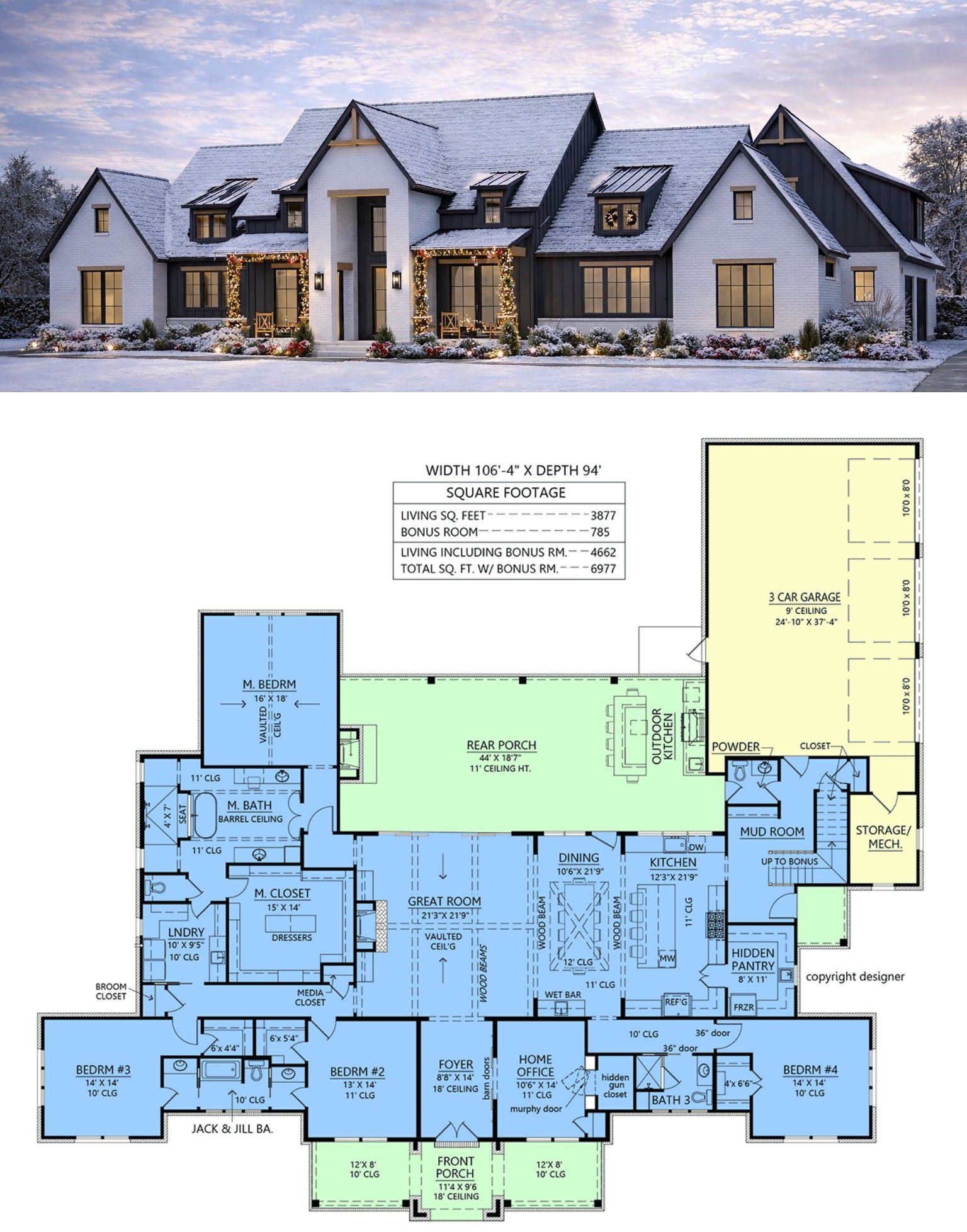 A broad covered front porch invites you into the home, while a deep rear porch becomes the everyday outdoor hub for dining and relaxation. The overall footprint spans about 106′ 4″ wide × 93′ 11″ deep, creating a commanding presence that fits comfortably on a suburban or countryside lot.