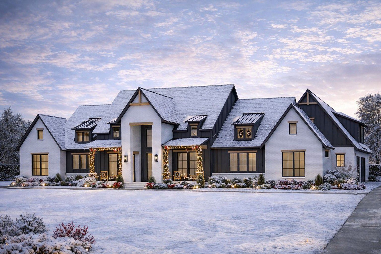 The exterior presents a striking New American farmhouse aesthetic with balanced rooflines, crisp siding, and well-proportioned covered porch spaces that enhance curb appeal and provide everyday outdoor rooms.