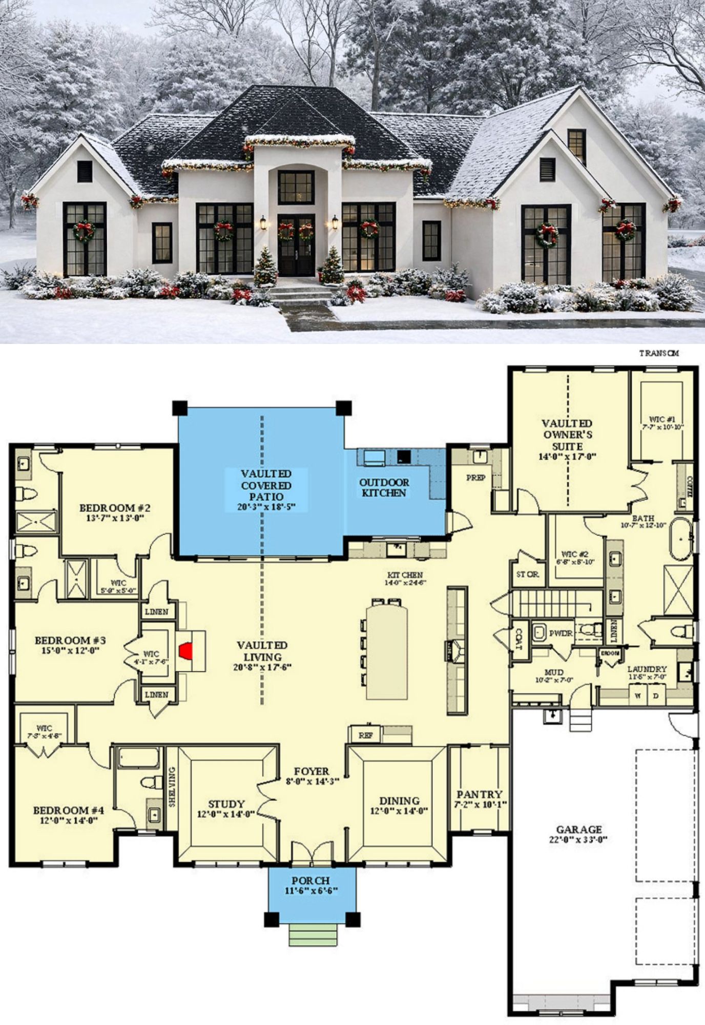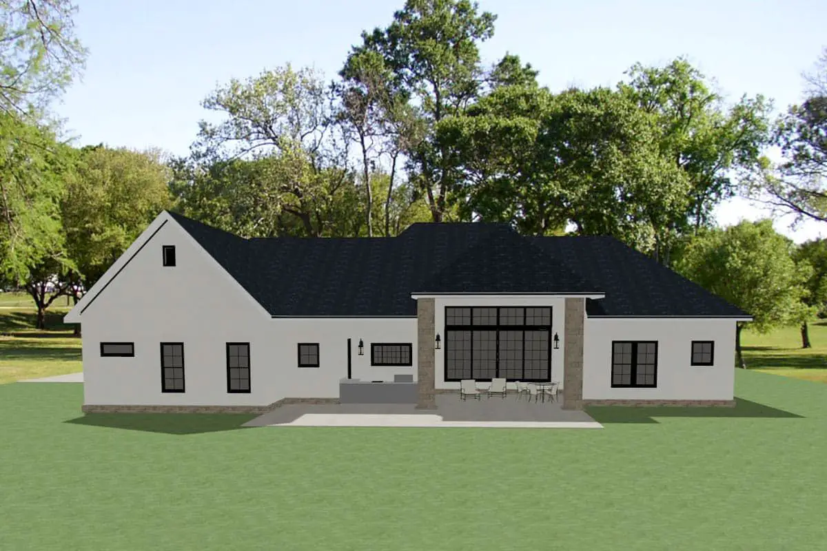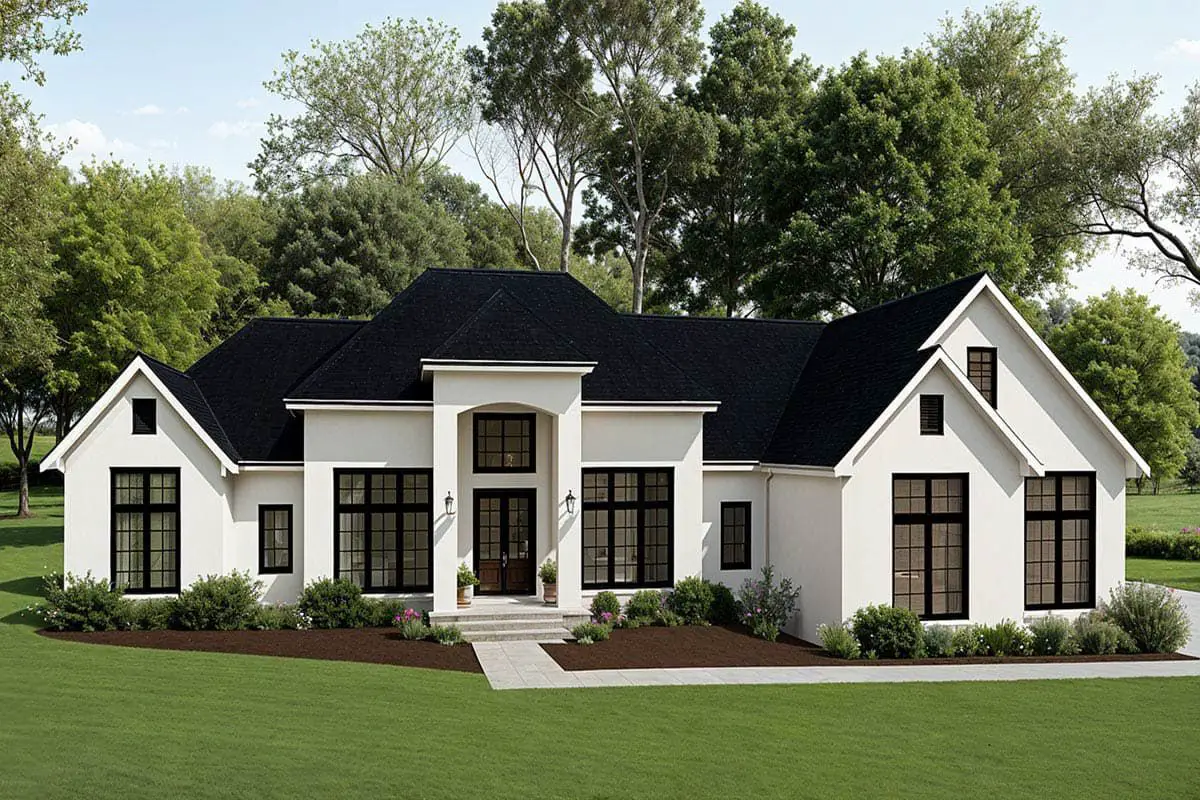 This transitional country house plan offers about 3,637 sq ft of well-designed one-story living space with a versatile layout that blends everyday comfort with refined architectural elements.