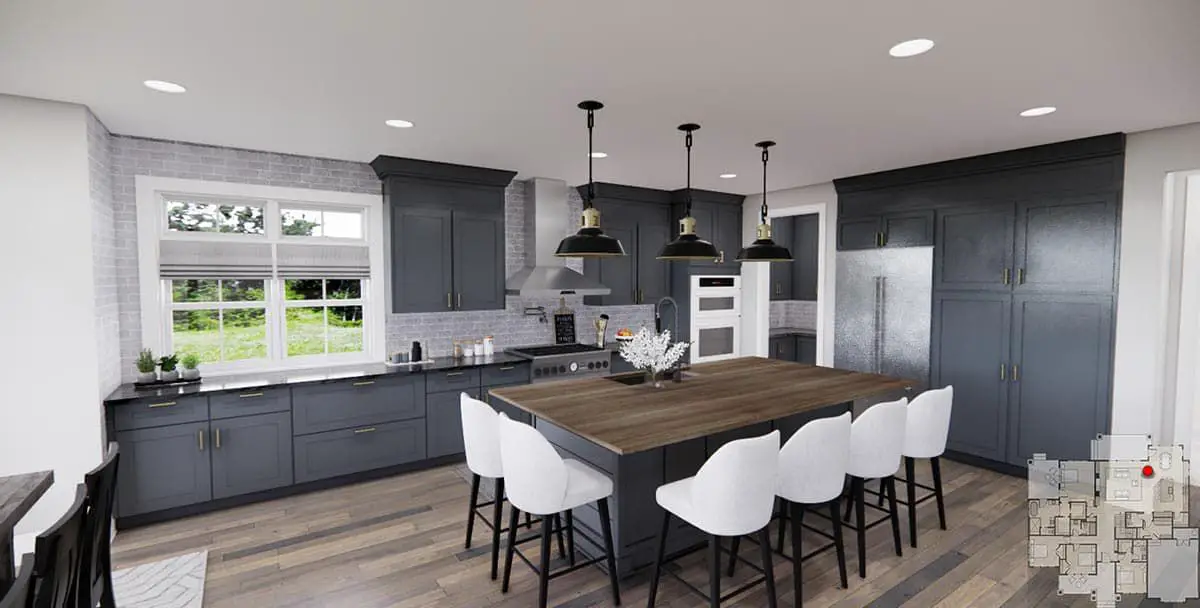 - Large kitchen island that supports meal prep, casual dining, and social interaction.