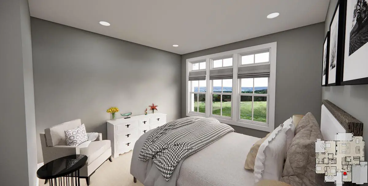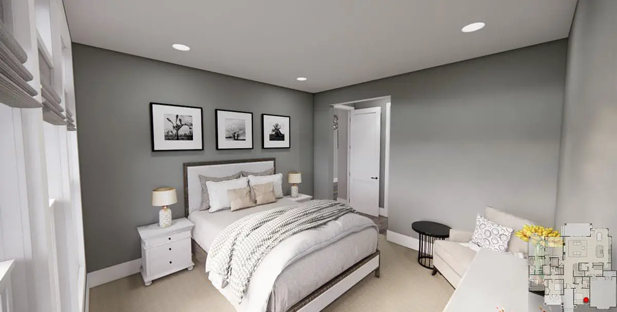 This split bedroom arrangement enhances privacy while keeping bedrooms just a few steps from shared living areas.