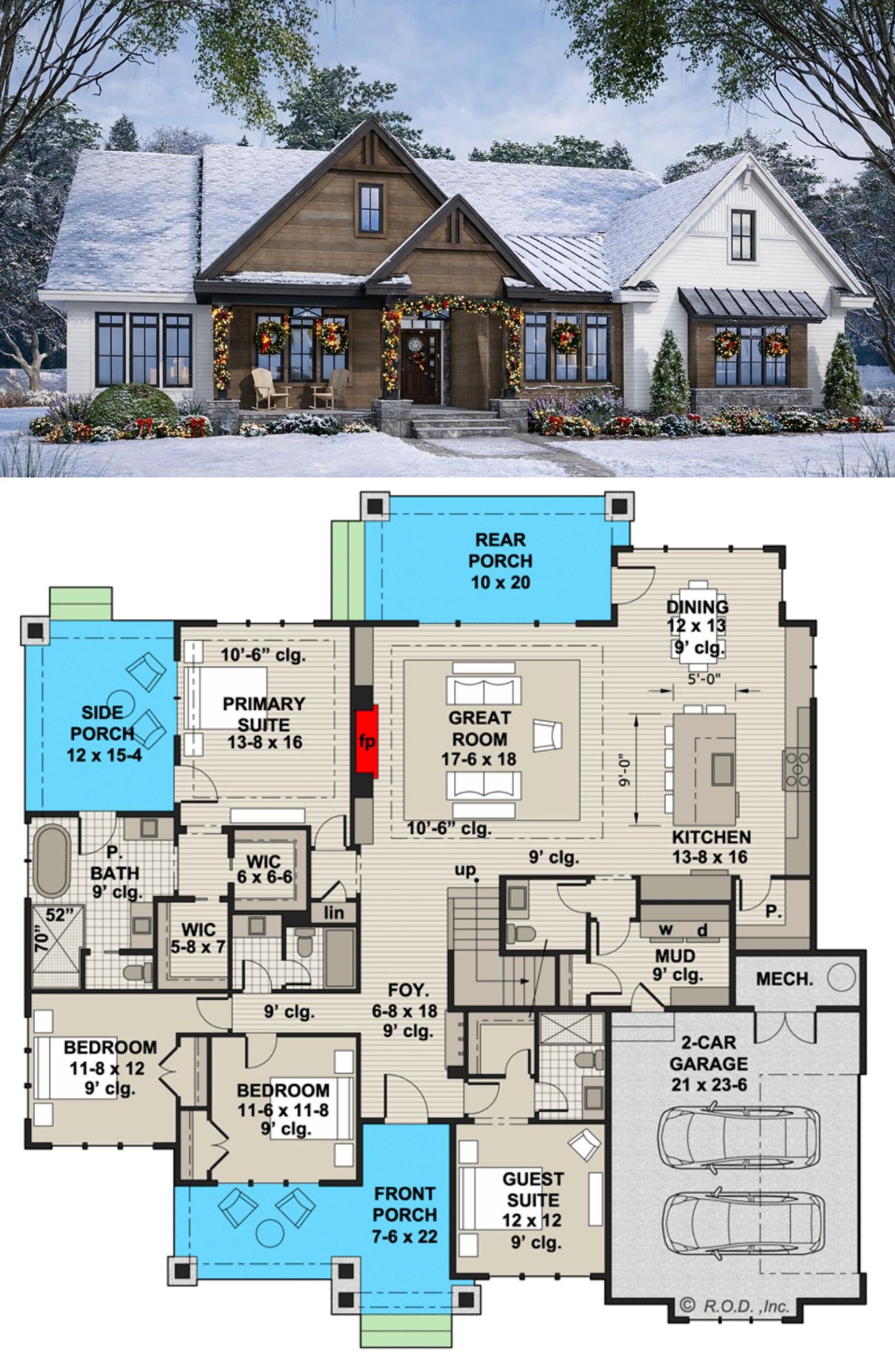 - The **covered front porch** creates a welcoming outdoor room for everyday use and entertaining.