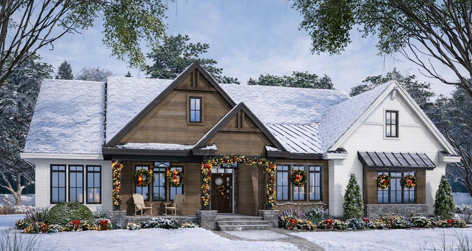 Balanced rooflines, plentiful windows, and thoughtful material detailing create visual interest while maintaining a timeless aesthetic that fits both rural and suburban settings. The footprint spans approximately 67′ 8″ wide × 66′ 10″ deep, offering a comfortable street presence without overwhelming the site.
