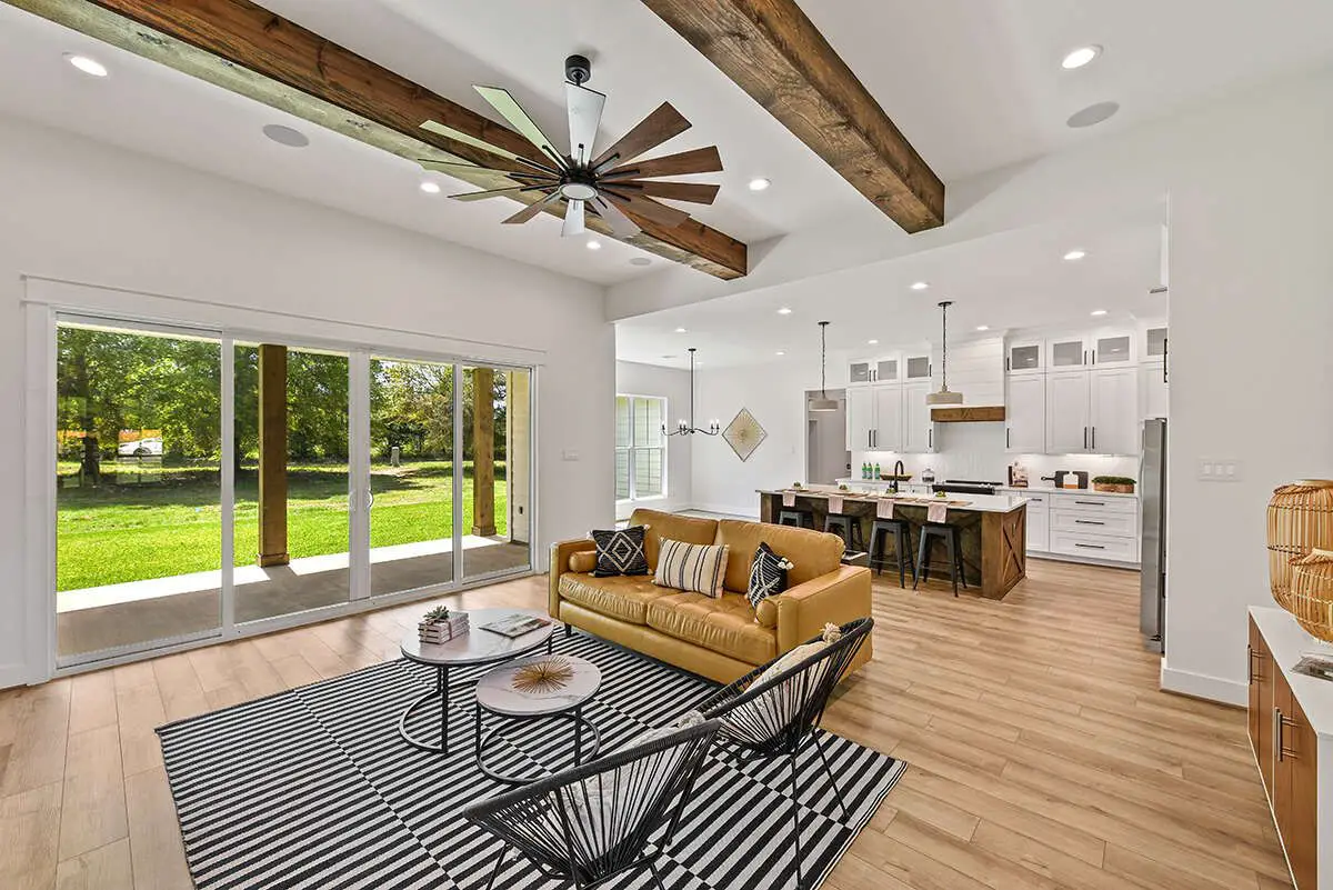 Large openings and French doors enhance natural light and visual openness, linking indoor zones with the rear covered porch and outdoor living spaces.