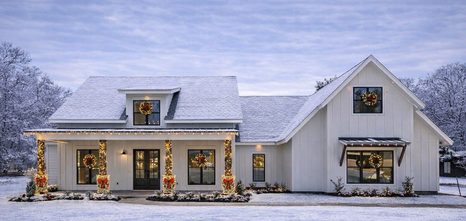From the curb, this home welcomes you with a broad covered front porch framed by columned beams — a signature element of country design that invites relaxed outdoor living and casual greeting space for guests.