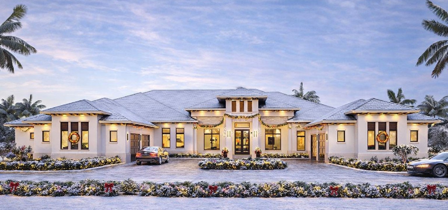 The exterior showcases classic Mediterranean proportions with stucco or similar walls, low-pitched rooflines, and broad overhangs that shade and unify the design.