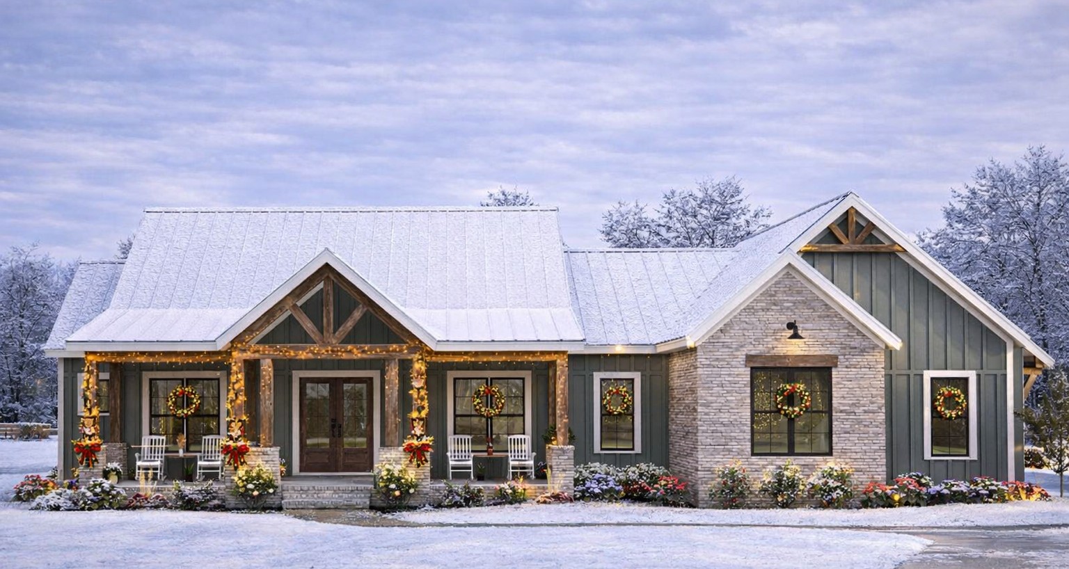 From the street, the exterior exudes classic modern farmhouse charm — crisp rooflines, balanced gables, and a broad covered front porch create visual appeal and a welcoming entrance. The façade’s clean material palette and simple yet inviting form make this home adaptable to rural, suburban, or countryside settings.