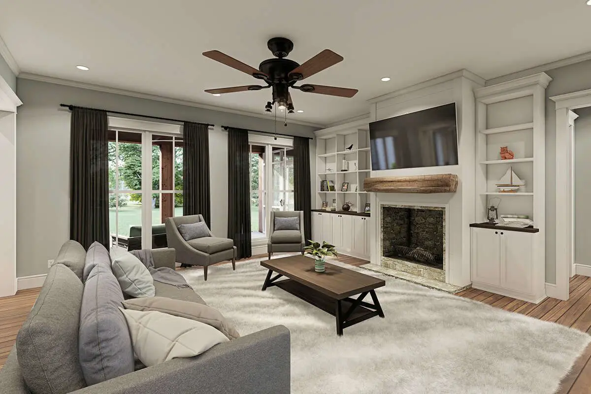 A standout feature of this plan is the generous screened porch off the rear — nearly spanning the width of the home — which provides a sheltered outdoor room for alfresco dining, lounging, or gathering regardless of weather. This porch strengthens the indoor-outdoor connection and becomes a natural extension of shared living spaces without compromising comfort.