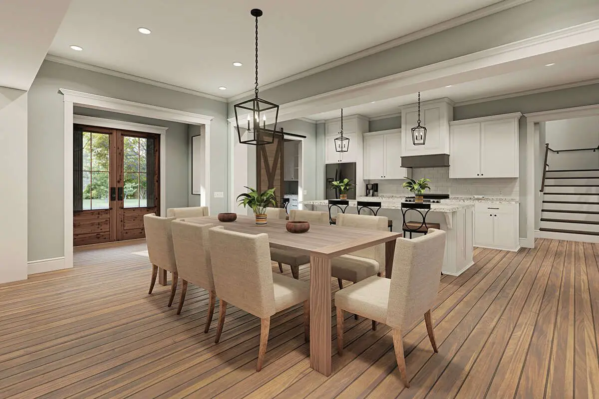 The great room sits adjacent to the dining zone and includes a cozy fireplace with built-ins — a natural gathering point for relaxation or hosting. Behind barn doors, a home office or study zone provides a quiet retreat without interrupting the openness of the shared spaces.