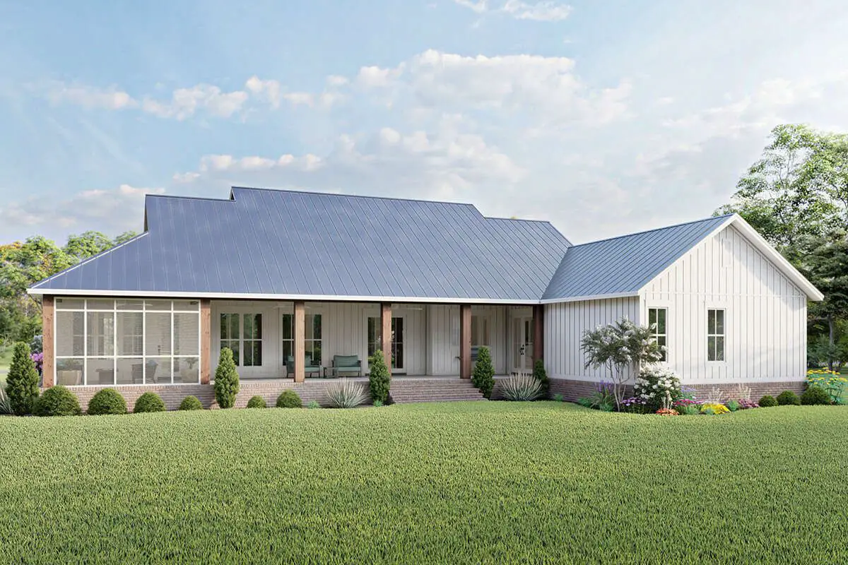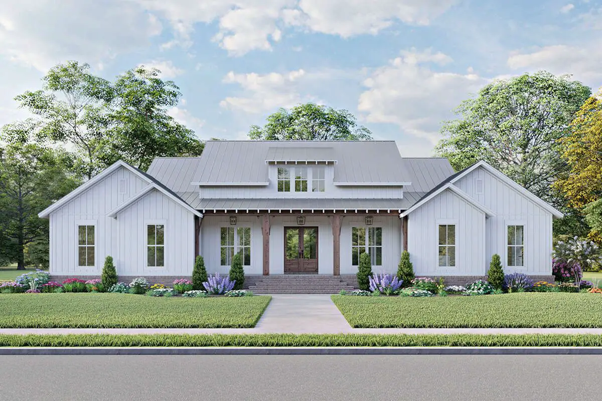 This modern farmhouse plan delivers approximately 2,589 sq ft of intelligently designed living space in a smart single-story layout with a welcoming front porch, versatile room placement, and thoughtful indoor-outdoor connections.