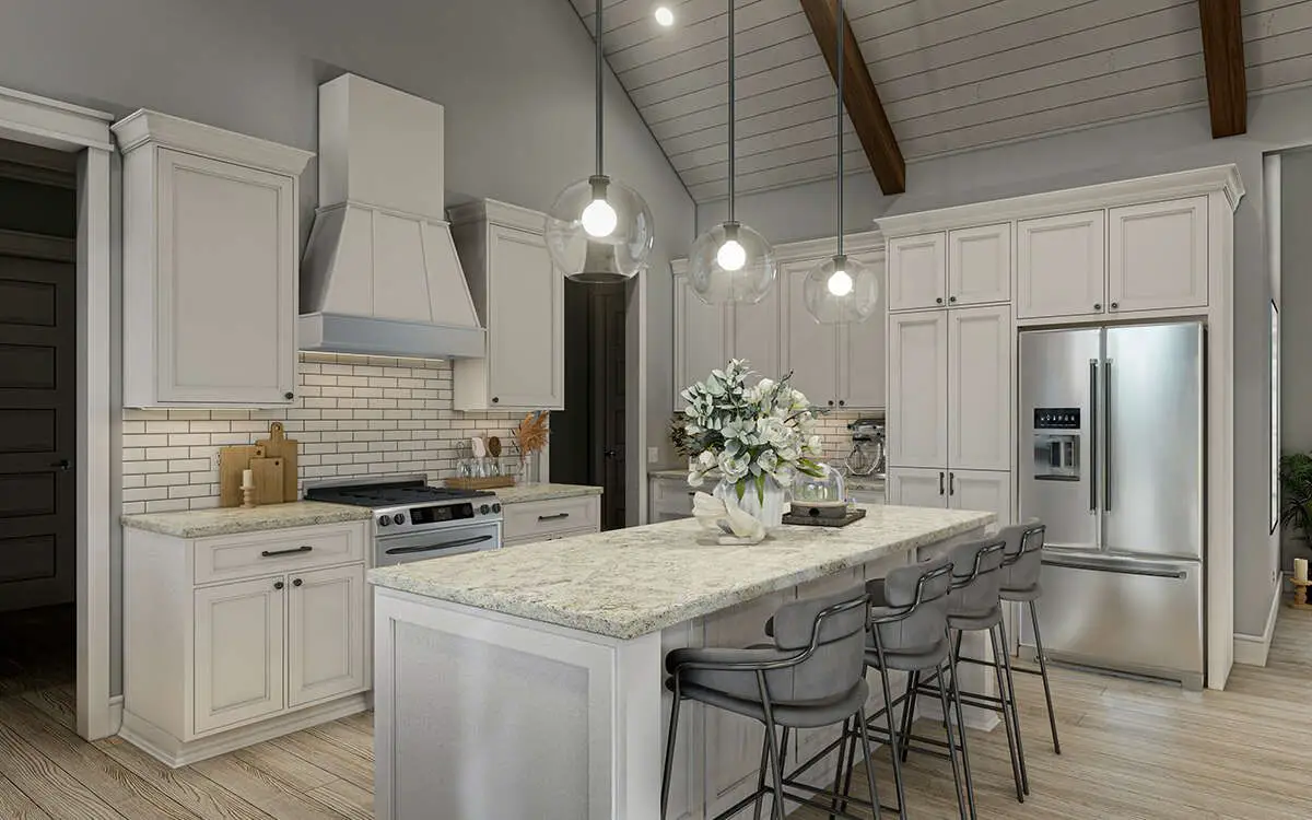 Adjacent to the great room, the kitchen features a large center island that provides generous prep space, casual dining opportunities, and room for social interaction. A sizeable walk-in pantry keeps seasonal accents and everyday essentials organized and within reach. The dining area flows naturally from the kitchen and connects to the rear outdoor living space, making meals and entertaining effortless.