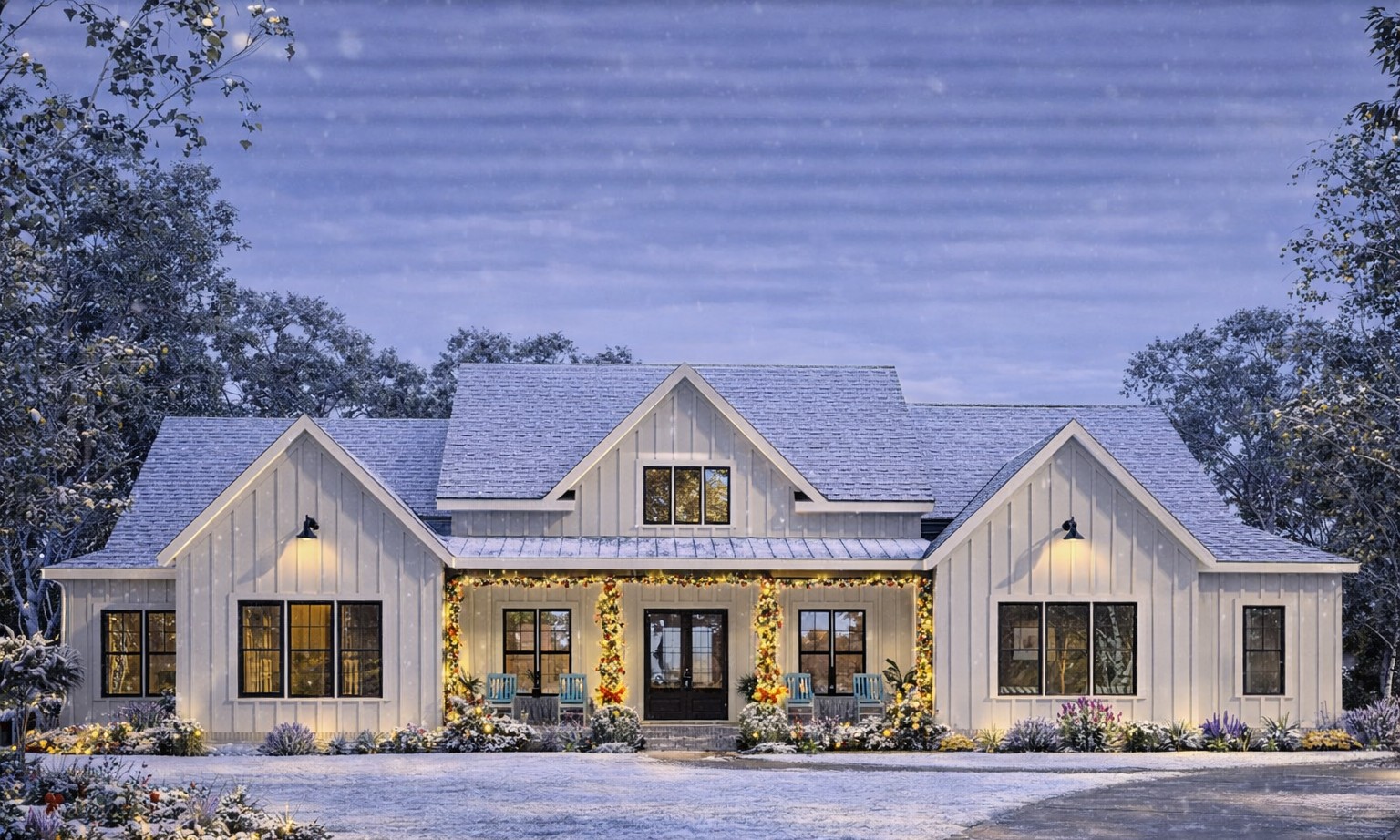 The exterior features modern farmhouse proportions with board-and-batten siding, multiple gables, abundant windows, an extended covered front porch, and thoughtful indoor-outdoor connections that make this home feel bright, welcoming, and functional.