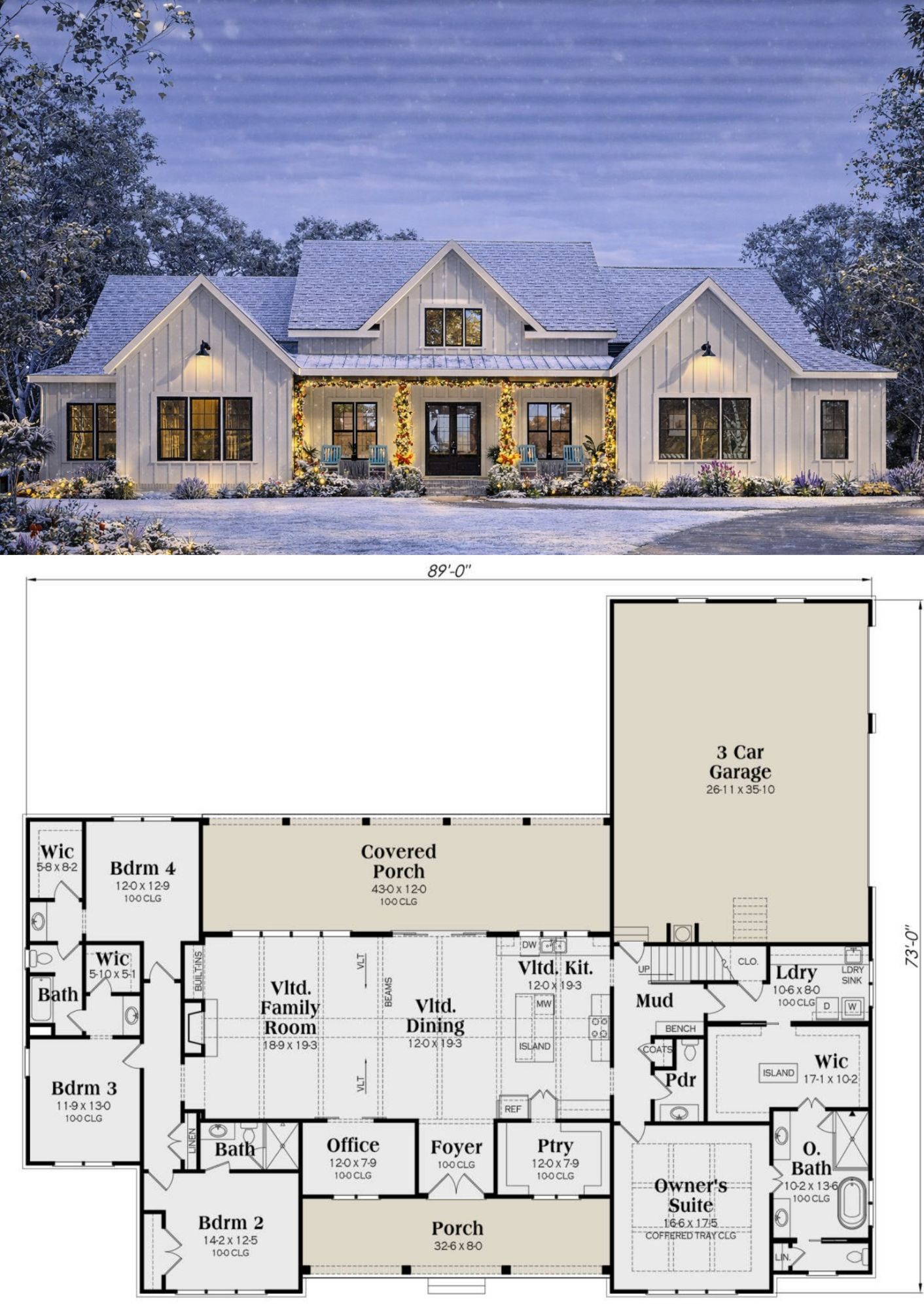 This modern farmhouse plan offers approximately 3,066 sq ft of thoughtfully designed one-story living space with an attached 3-car side-entry garage (~993 sq ft), blending open shared spaces, private retreats, and flexible zones to accommodate both everyday living and entertaining.