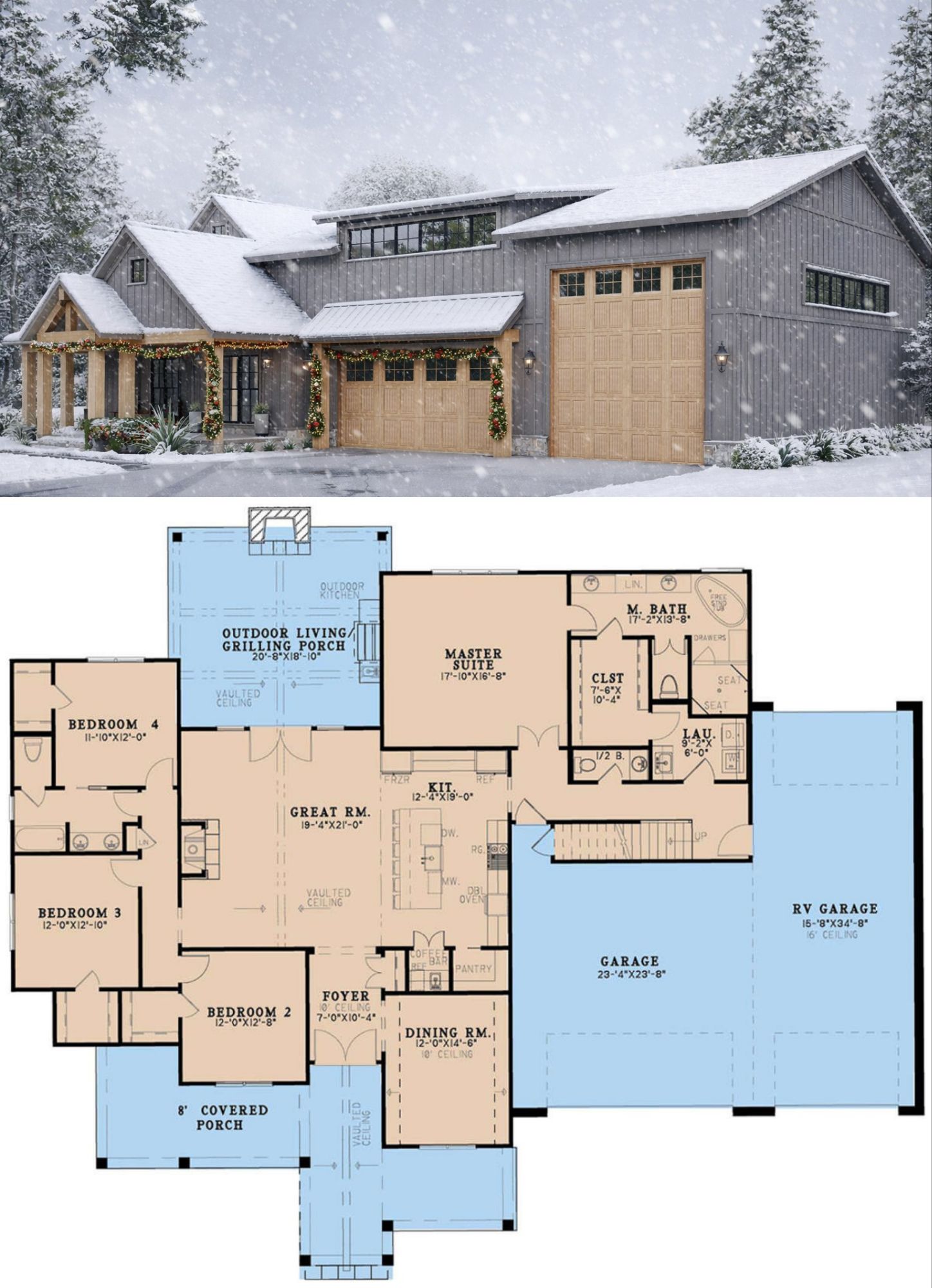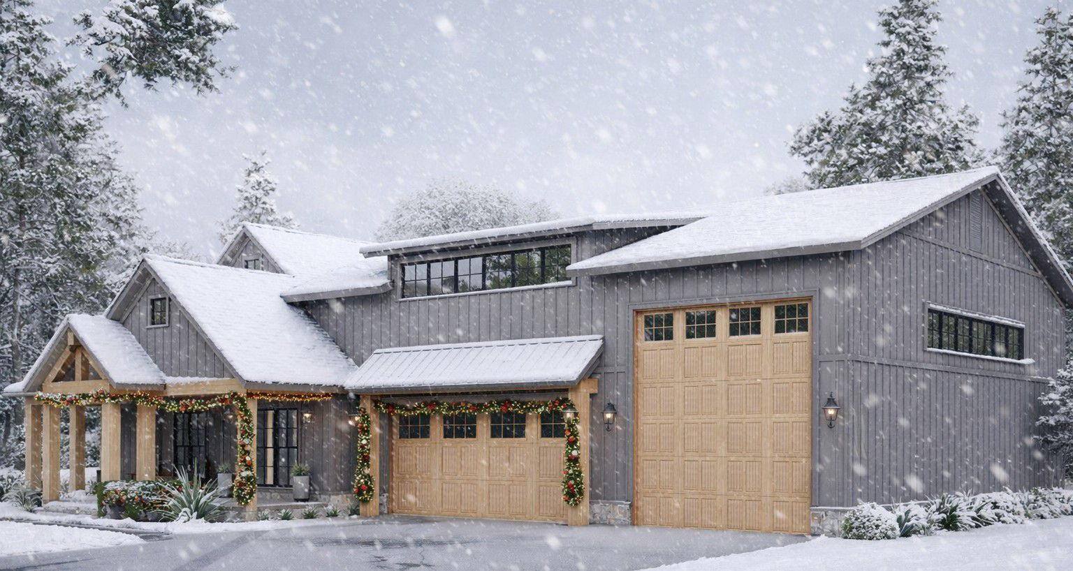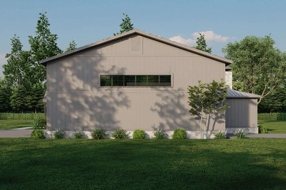 Balanced proportions and large windows across the façade allow abundant natural light into the interior, adding to the home’s overall appeal. A side-entry three-car garage integrates seamlessly into the design, preserving curb appeal while offering ample parking and storage capacity. The home’s generous footprint — approximately 111′-5″ wide × 75′-2″ deep — makes a notable presence on suburban or country lots.