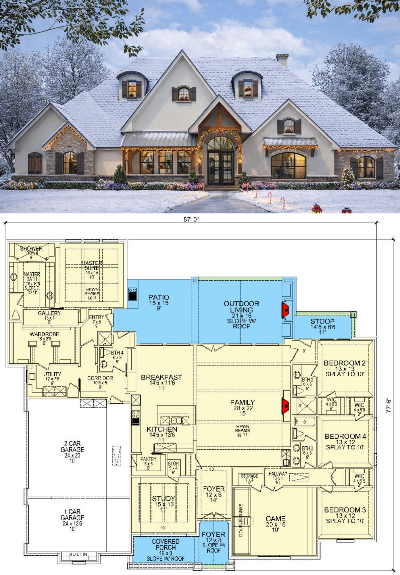 The home’s overall footprint — approximately 87′ wide × 78′ deep — gives it a grounded presence suited for suburban, rural, or acreage settings. citeturn0view0