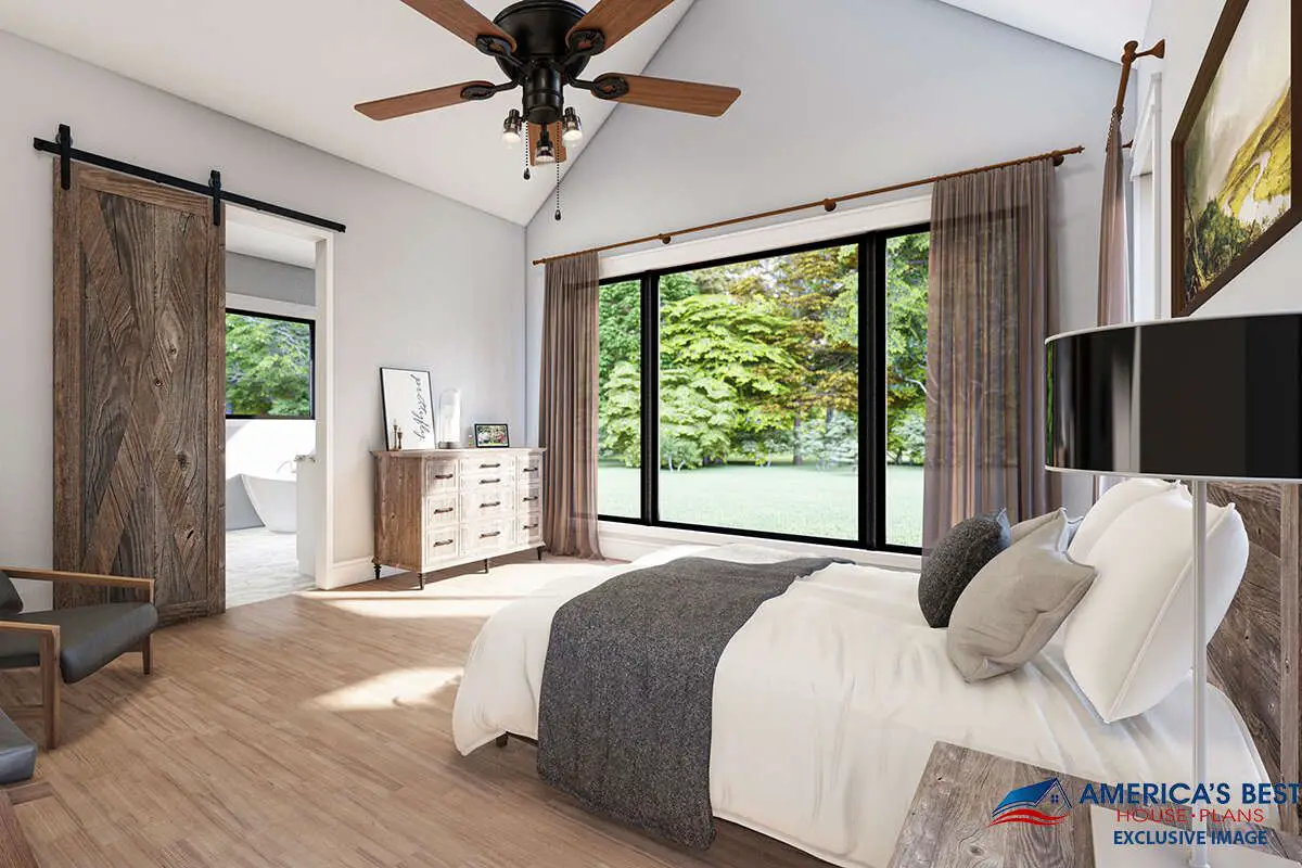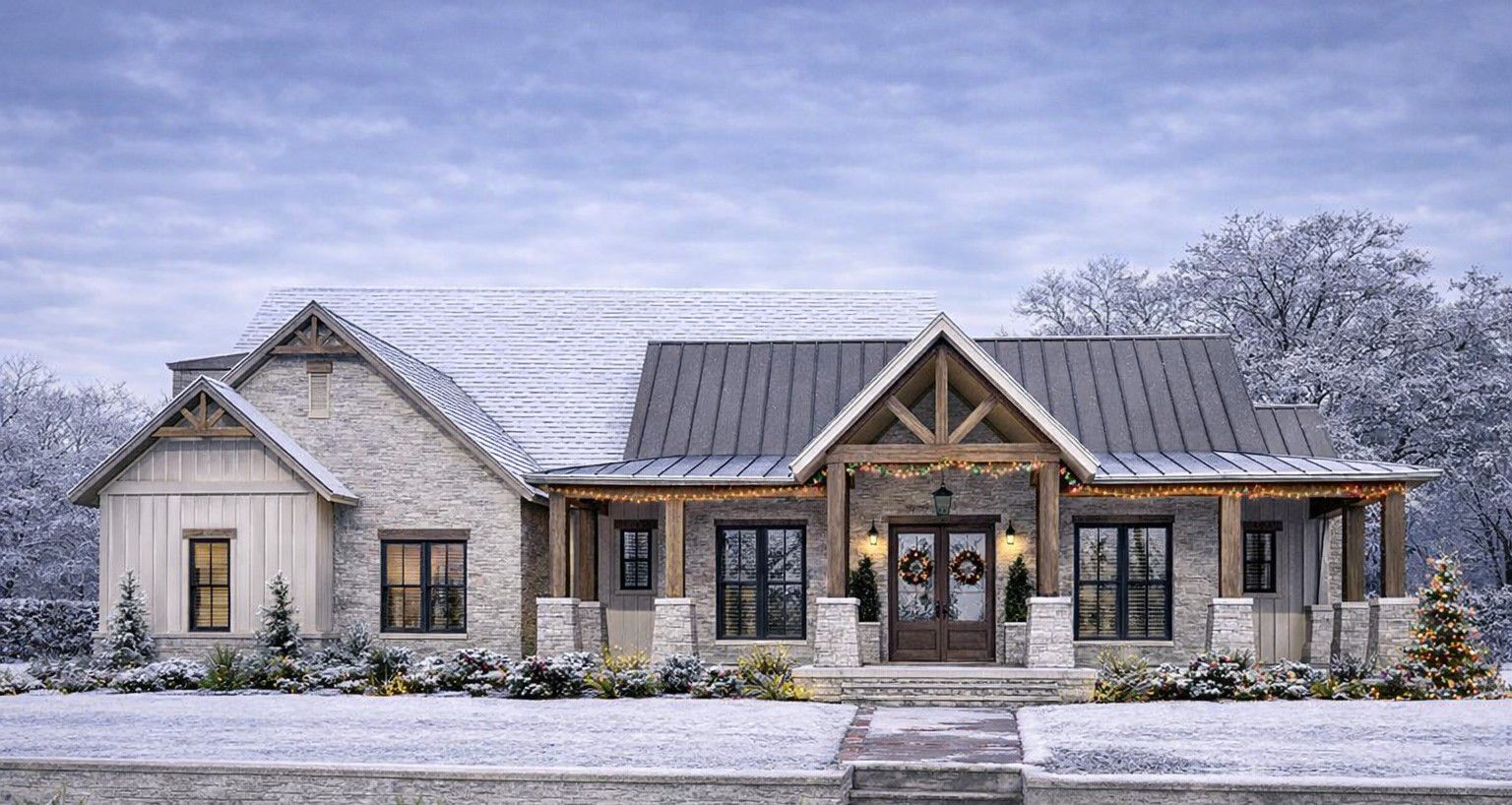 At roughly 76′ wide × 70′-8″ deep, the footprint gives the home a strong and welcoming presence on a range of suburban, rural, or acreage lots. Large windows across the façade bring abundant natural light into the interior shared spaces and help integrate the indoors with the surrounding landscape.
