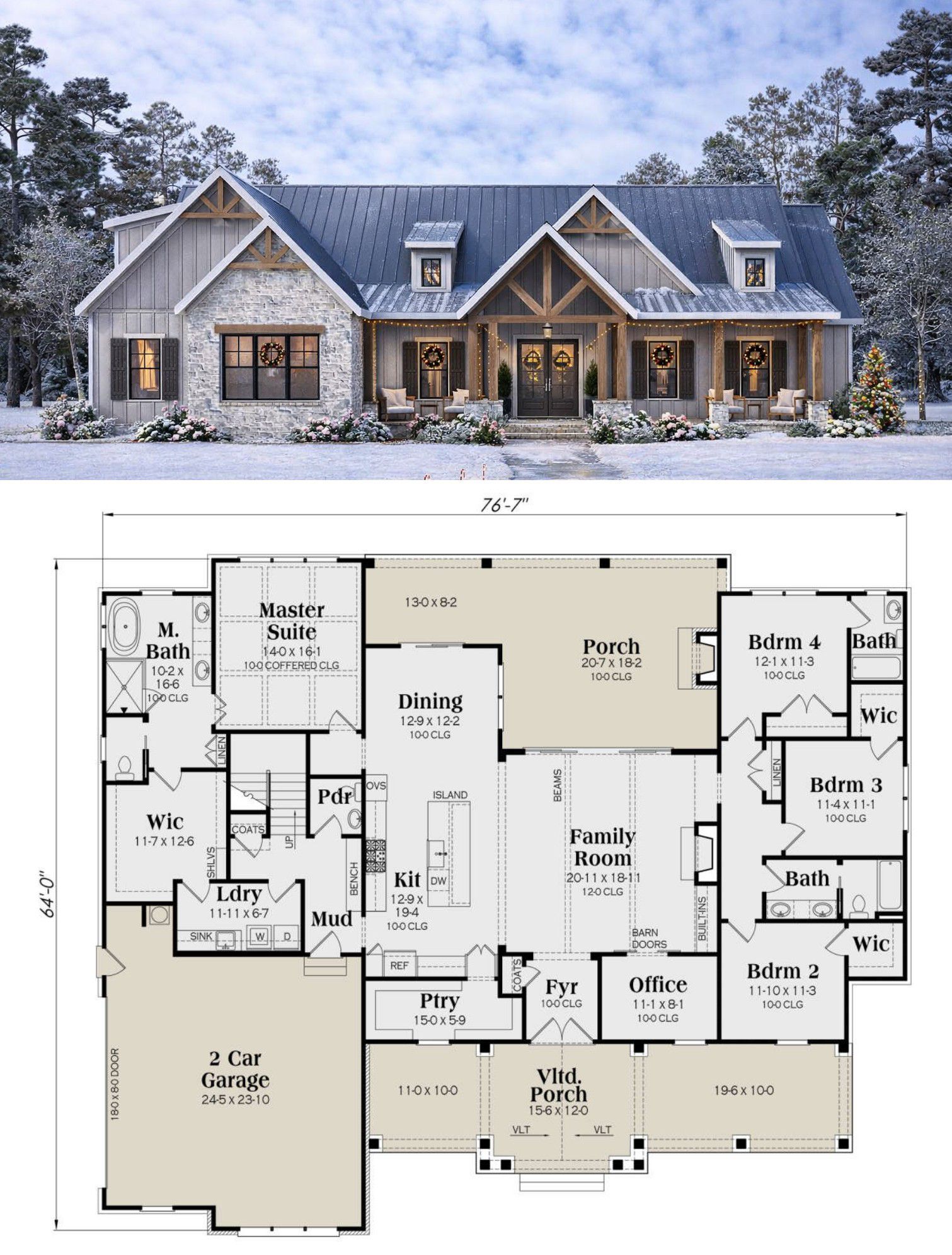 Large windows throughout the façade help bring natural light into the core shared spaces while giving the home an inviting, well-proportioned presence. The footprint measures roughly 76′-7″ wide × 64′ deep, making it suitable for a range of suburban or country lot sizes.