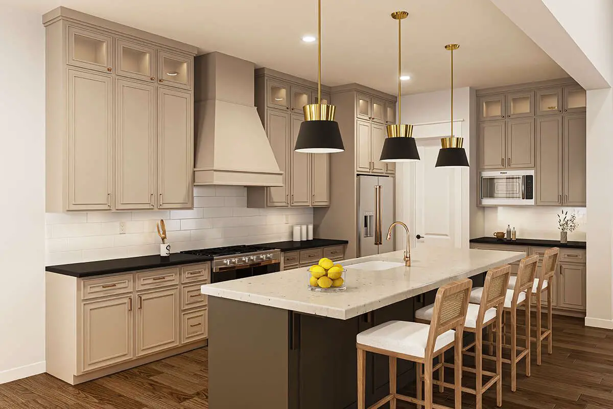 - Large kitchen island with seating supports meal prep, casual dining, and social interaction.