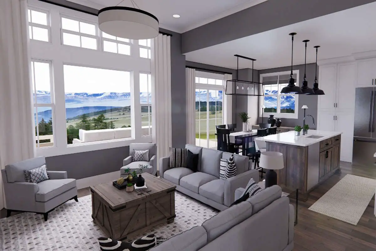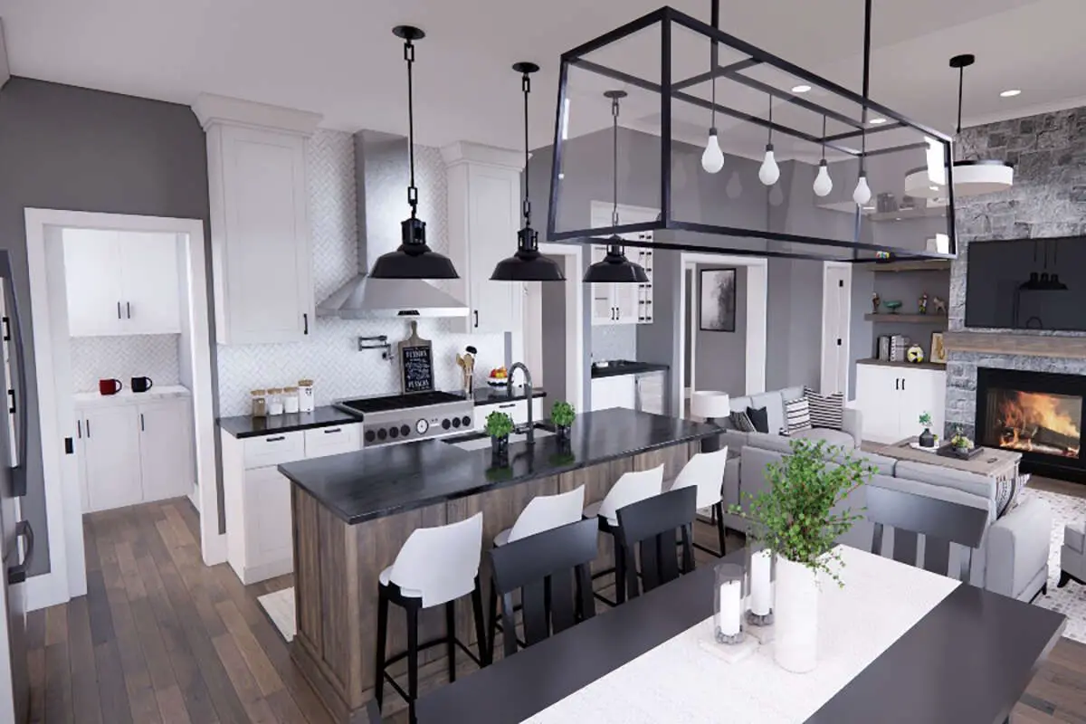 Stepping inside from the front porch, you are greeted by an open concept shared zone where the great room, dining area, and kitchen flow together seamlessly.