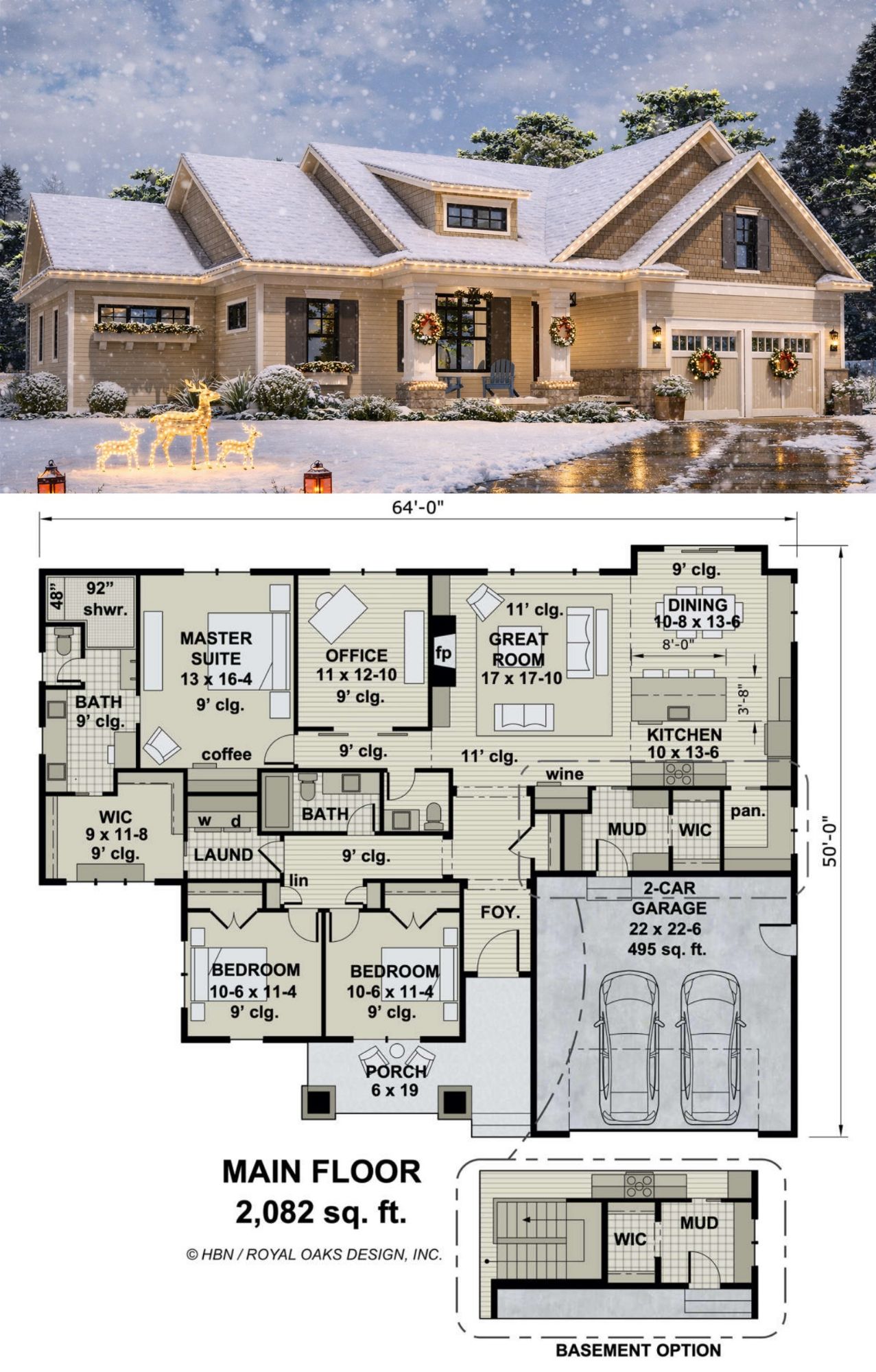 A mix of traditional siding and architectural accents enhances the home’s visual appeal, while well-placed windows frame outdoor views and bring abundant daylight into the interior spaces. At approximately 64′ wide × 50′ deep, the footprint sits comfortably on a variety of suburban or rural lots, presenting an inviting and proportioned façade.