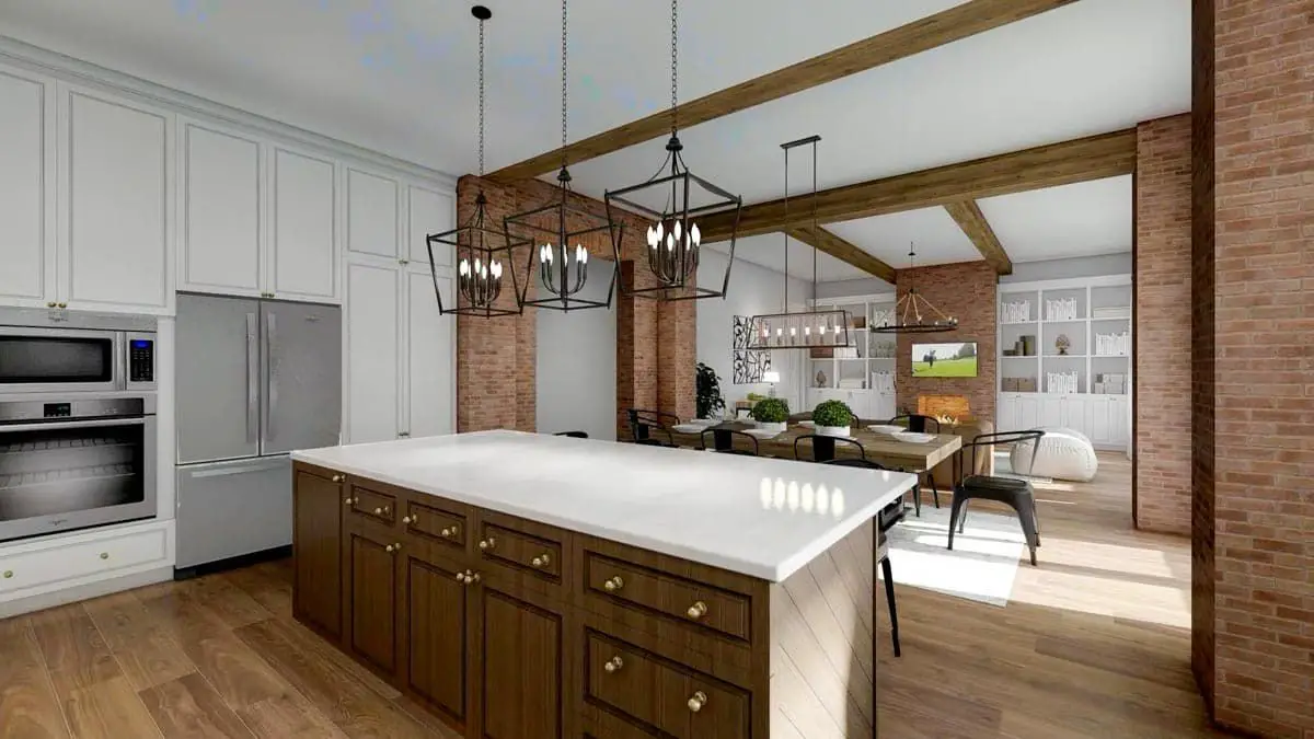 The kitchen anchors the central hub with a large island that serves as a prep zone, casual dining spot, and social gathering point. Ample counter workspaces and a true walk-in pantry enhance functionality for everyday cooking and entertaining.