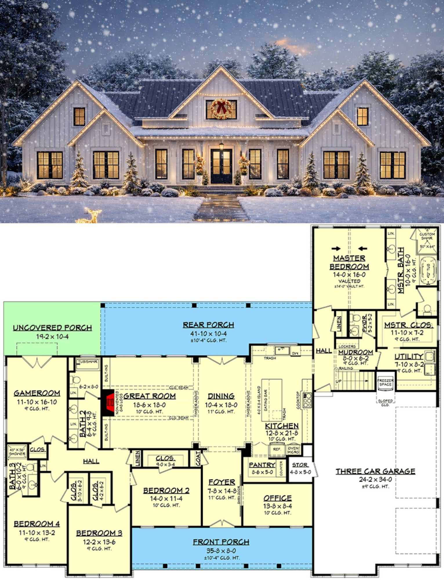 With classic modern farmhouse appeal, generous shared areas, private zones, and specialized rooms like a game room and optional bonus suite, this plan balances style with practical flow for modern living.
