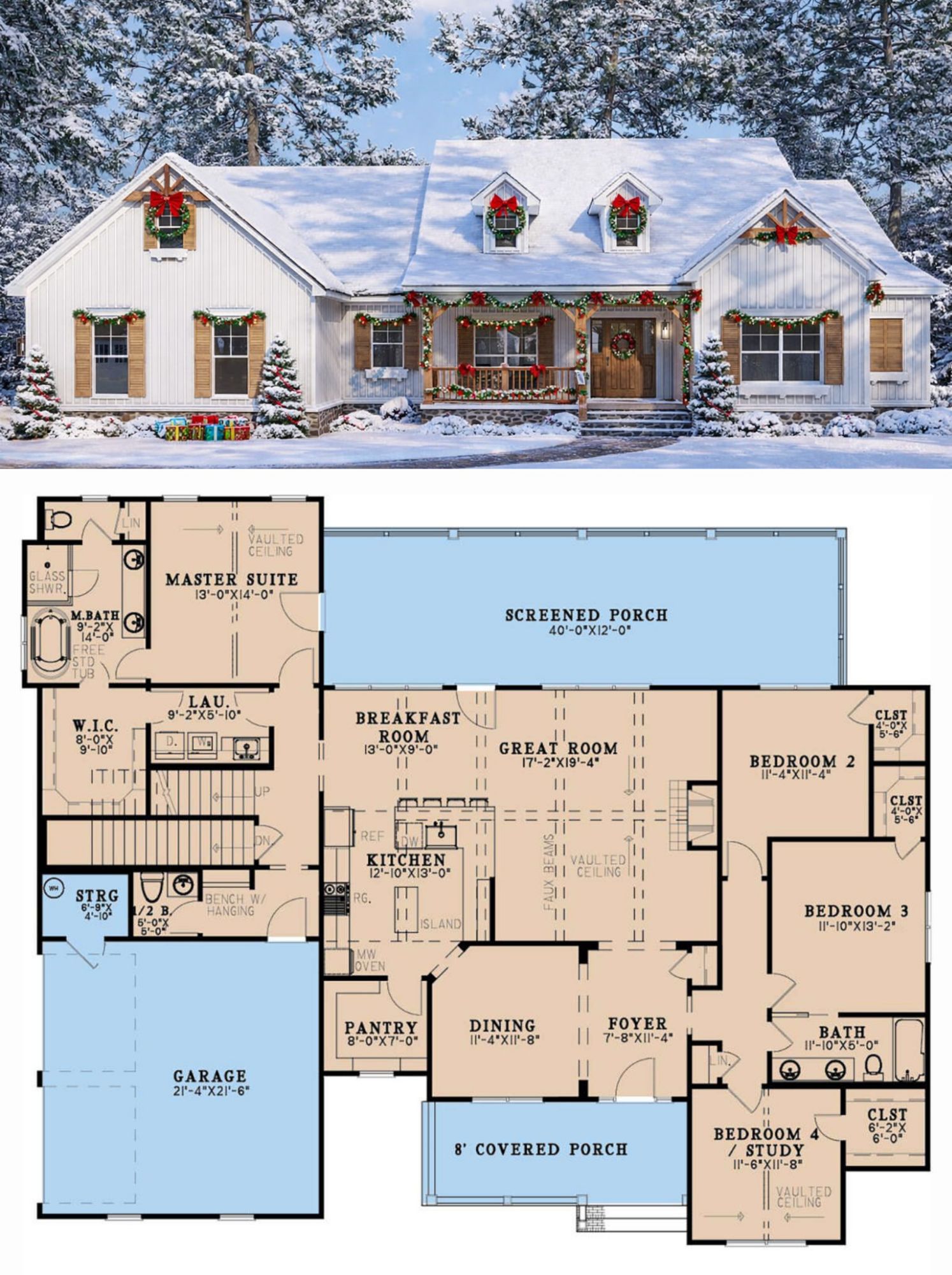 This modern farmhouse plan delivers approximately 3,369 sq ft of spacious and thoughtfully arranged single-story living space that blends classic farmhouse appeal with contemporary open-plan design.